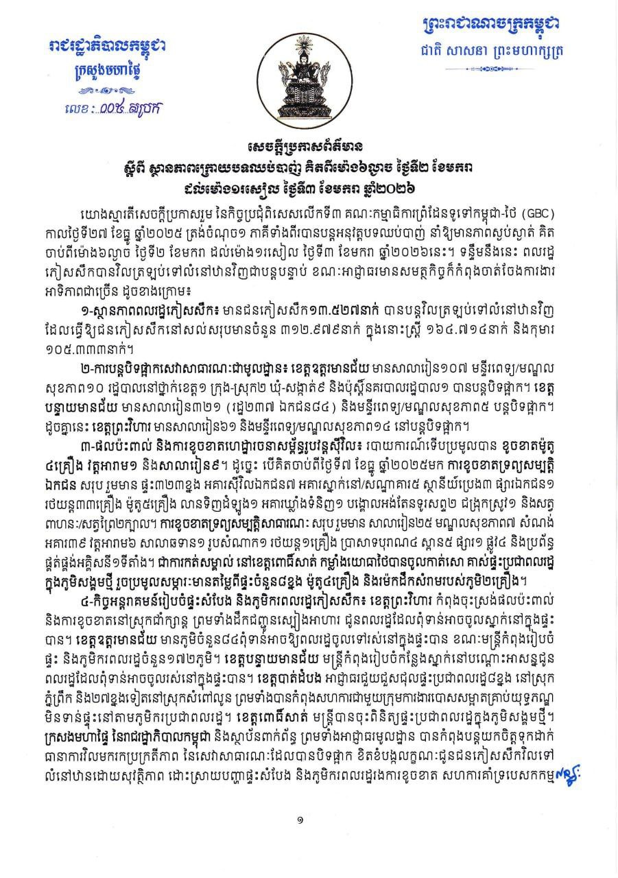 គិតចាប់ពីម៉ោង៦ល្ងាច ថ្ងៃទី២ ខែមករា ដល់ម៉ោង១រសៀល ថ្ងៃទី៣ ខែមករា ឆ្នាំ២០២៦នេះ មានជនភៀសសឹក១៣.៥២៧នាក់ បានបន្តវិលត្រឡប់ទៅលំនៅឋានវិញ ដែលធ្វើឱ្យជនភៀសសឹកនៅសល់សរុបមានចំនួន ៣១២.៩៧៩នាក់ ក្នុងនោះស្រី្ត ១៦៤.៧១៤នាក់ និងកុមារ១០៥.៣៣៣នាក់។ ចំណែកអាជ្ញាធរមានសមត្ថកិច្ច ក៏កំពុងចាត់ចែងការងារអាទិភាពជាច្រើននៅតាមភូមិករពលរដ្ឋ។ នេះបើតាមសេចក្ដីប្រកាសព័ត៌មាន របស់ក្រសួងមហាផ្ទៃ។