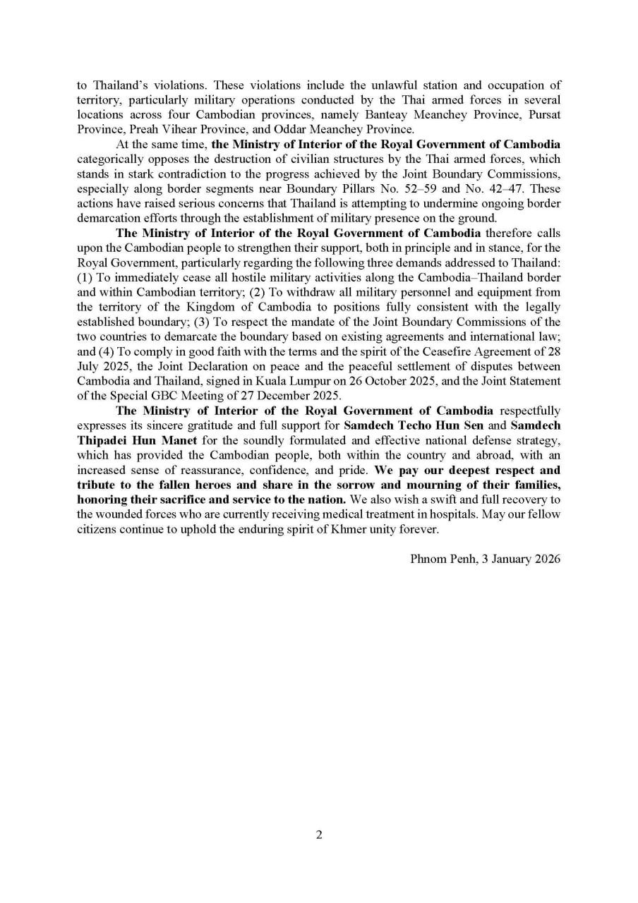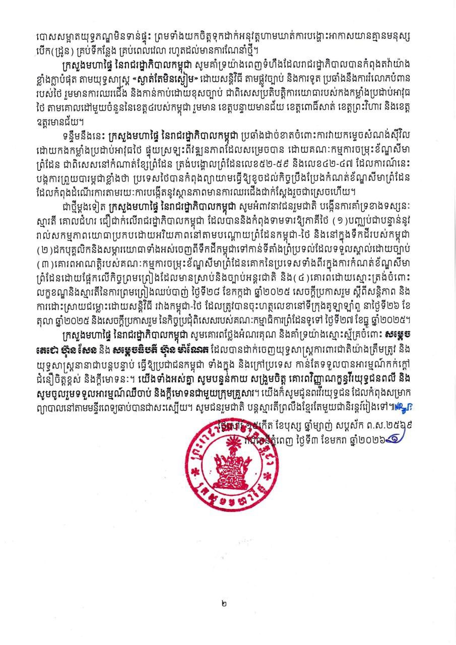 ជាថ្មីម្តងទៀត ក្រសួងមហាផ្ទៃ នៃរាជរដ្ឋាភិបាលកម្ពុជា សូមអំពាវនាវជនរួមជាតិ បង្កើនការគាំទ្រខាងទស្សនៈ ស្មារតី គោលជំហរ ជឿជាក់លើរាជរដ្ឋាភិបាលកម្ពុជា ដែលបាននិងកំពុងទាមទារឱ្យភាគីថៃ (១)បញ្ឈប់ជាបន្ទាន់នូវ រាល់សកម្មភាពយោធាប្រកបដោយអរិយភាពនៅតាមបណ្តោយព្រំដែនកម្ពុជា-ថៃ និងនៅក្នុងទឹកដីរបស់កម្ពុជា (២)ដកបុគ្គលិកនិងសម្ភារយោធាទាំងអស់ចេញពីទឹកដីកម្ពុជាទៅកាន់ទីតាំងព្រំប្រទល់ដែលទទួលស្គាល់ដោយច្បាប់ (៣)គោរពអាណត្តិរបស់គណៈកម្មការចម្រុះខ័ណ្ឌសីមាព្រំដែនគោកនៃប្រទេសទាំងពីរក្នុងការកំណត់ខ័ណ្ឌសីមា ព្រំដែនដោយផ្អែកលើកិច្ចព្រមព្រៀងដែលមានស្រាប់និងច្បាប់អន្តរជាតិ និង(៤)គោរពដោយស្មោះត្រង់ចំពោះ លក្ខខណ្ឌនិងស្មារតីនៃការព្រមព្រៀងឈប់បាញ់ ថ្ងៃទី២៨ ខែកក្កដា ឆ្នាំ២០២៥ សេចក្តីប្រកាសរួម ស្តីពីសន្តិភាព និង ការដោះស្រាយជម្លោះដោយសន្តិវិធី រវាងកម្ពុជា-ថៃ ដែលត្រូវបានចុះហត្ថលេខានៅទីក្រុងគូឡាឡាំពួ នាថ្ងៃទី២៦ ខែ តុលា ឆ្នាំ២០២៥ និងសេចក្តីប្រកាសរួម នៃកិច្ចប្រជុំពិសេសរបស់គណៈកម្មាធិការព្រំដែនទូទៅ ថ្ងៃទី២៧ ខែធ្នូ ឆ្នាំ២០២៥។