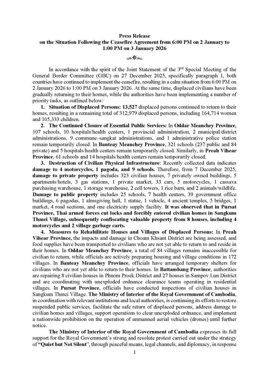 ក្រសួងមហាផ្ទៃចេញប្រកាស៖ គិតចាប់ពីម៉ោង៦ល្ងាចថ្ងៃទី២ ខែមករា-ម៉ោង១រសៀល ថ្ងៃទី៣ ខែមករា ឆ្នាំ២០២៦នេះ មានជនភៀសសឹក១៣.៥២៧នាក់ បានបន្តវិលត្រឡប់ទៅលំនៅឋានវិញ ដែលធ្វើឱ្យជនភៀសសឹកនៅសល់សរុបមានចំនួន ៣១២.៩៧៩នាក់