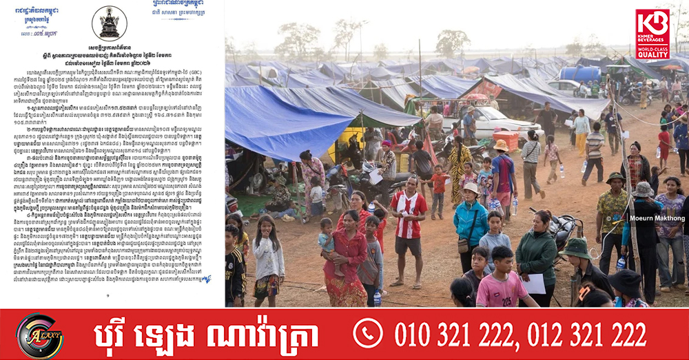 ៤-កិច្ចអន្តរាគមន៍រៀបចំផ្ទះសំបែង និងភូមិករពលរដ្ឋភៀសសឹក៖ ខេត្តព្រះវិហារ កំពុងចុះស្រង់ផលប៉ះពាល់ និងការខូចខាតនៅស្រុកជាំក្សាន្ត ព្រមទាំងដឹកជញ្ជូនស្បៀងអាហារ ជូនពលរដ្ឋដែលពុំទាន់អាចចូលស្នាក់នៅក្នុងផ្ទះ បាន។ ខេត្តឧត្តរមានជ័យ មានភូមិចំនួន៨៤ពុំទាន់អាចឱ្យពលរដ្ឋចូលទៅរស់នៅក្នុងផ្ទះបាន ខណៈមន្ត្រីកំពុងរៀបចំ ផ្ទះ និងភូមិករពលរដ្ឋចំនួន១៧២ភូមិ។ ខេត្តបន្ទាយមានជ័យ មន្ត្រីកំពុងរៀបចំកន្លែងស្នាក់នៅបណ្តោះអាសន្នជូន ពលរដ្ឋដែលពុំទាន់អាចចូលរស់នៅក្នុងផ្ទះបាន។ ខេត្តបាត់ដំបង អាជ្ញាធរជួយជួសជុលផ្ទះប្រជាពលរដ្ឋ៨ខ្នង នៅស្រុក ភ្នំព្រឹក និង២៧ខ្នងទៀតនៅស្រុកសំពៅលូន ព្រមទាំងបានកំពុងសហការជាមួយក្រុមការងារបោសសម្អាតគ្រាប់យុទ្ធភណ្ឌ មិនទាន់ផ្ទុះនៅតាមភូមិករប្រជាពលរដ្ឋ។ ខេត្តពោធិ៍សាត់ មន្ត្រីបានចុះពិនិត្យផ្ទះប្រជាពលរដ្ឋក្នុងភូមិសង្គមថ្មី។ ក្រសងមហាផ្ទៃ នៃរាជរដ្ឋាភិបាលកម្ពុជា និងស្ថាប័នពាក់ព័ន្ធ ព្រមទាំងអាជ្ញាធរមូលដ្ឋាន បានកំពុងបន្តយកចិត្តទុកដាក់ ធានាការវិលមករកប្រក្រតីភាព នៃសេវាសាធារណៈដែលបានបិទផ្អាក ខិតខំបង្កលក្ខណៈជូនជនភៀសសឹកវិលទេ លំនៅឋានដោយសុវត្ថិភាព ដោះស្រាយបញ្ហាផ្ទះសំបែង និងភូមិករពលរដ្ឋរងការខូចខាត សហការគាំទ្របេសកកម្មសព្រមទាំងយកចិត្តទុកដាក់អនុវត្តហាមឃាត់ការបង្ហោះអាកាសយានគ្មានមនុស្ស បោសសម្អាតយុទ្ធភណ្ឌមិនទាន់ផ្ទុះ បើក(ដ្រូន) គ្រប់ទីកន្លែង គ្រប់ពេលវេលា រហូតដល់មានការណែនាំថ្មី។