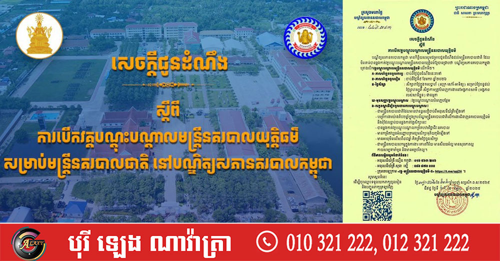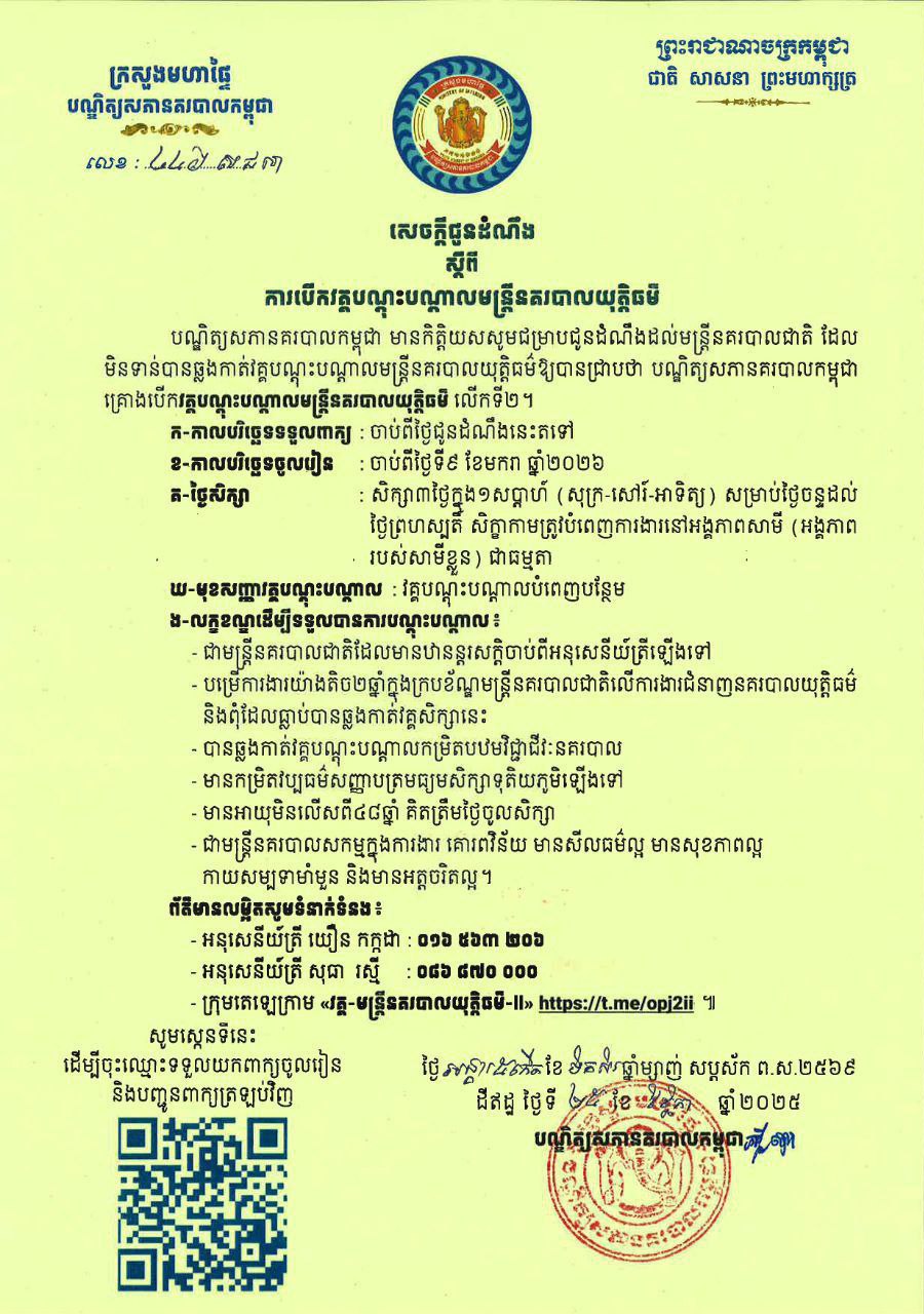 បណ្ឌិត្យសភានគរបាលកម្ពុជា ចេញសេចក្តីជូនដំណឹង ស្តីពីការបើកវគ្គបណ្តុះបណ្តាលមន្ត្រីនគរបាលយុត្តិធម៌