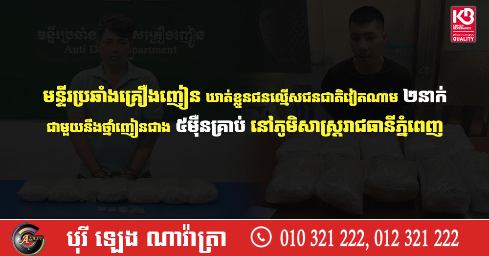 មន្ទីរប្រឆាំងគ្រឿងញៀន ឃាត់ខ្លួនជនល្មើសជនជាតិវៀតណាម ២នាក់ ជាមួយនឹងថ្នាំញៀនជាង ៥ម៉ឺនគ្រាប់ នៅភូមិសាស្ត្ររាជធានីភ្នំពេញ