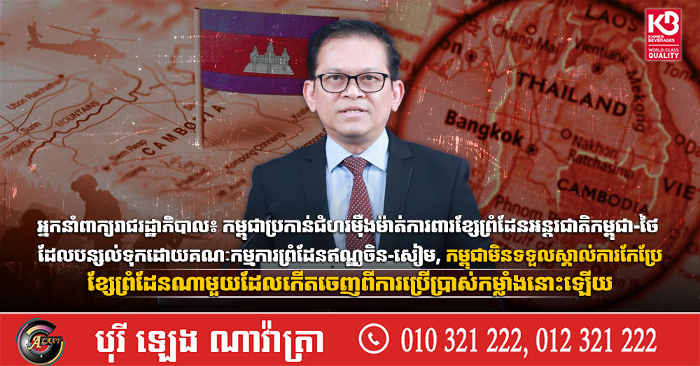 អ្នកនាំពាក្យរាជរដ្ឋាភិបាល៖ កម្ពុជាប្រកាន់ជំហរម៉ឺងម៉ាត់ការពារខ្សែព្រំដែនអន្តរជាតិកម្ពុជា-ថៃ ដែលបន្សល់ទុកដោយគណៈកម្មការព្រំដែនឥណ្ឌូចិន-សៀម, កម្ពុជាមិនទទួលស្គាល់ការកែប្រែខ្សែព្រំដែនណាមួយដែលកើតចេញពីការប្រើប្រាស់កម្លាំងនោះឡើយ