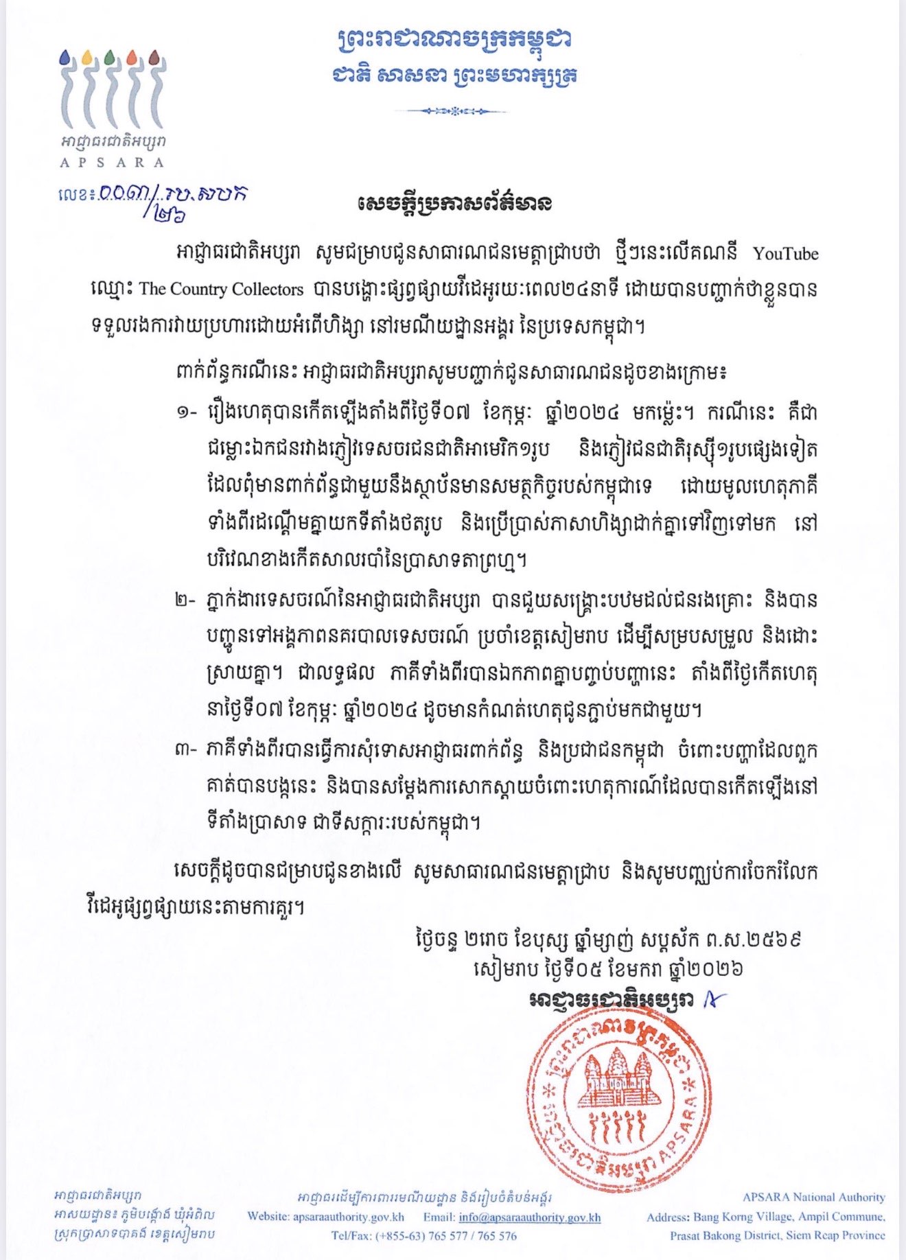(សៀមរាប)៖ អាជ្ញាធរជាតិអប្សរា សូមជម្រាបជូនសាធារណជនមេត្តាជ្រាបថា ថ្មីៗនេះលើគណនី YouTube ឈ្មោះ The Country Collectors បានបង្ហោះផ្សព្វផ្សាយវីដេអូ រយៈពេល២៤នាទី ដោយបានបញ្ជាក់ថា ខ្លួនបានទទួលរងការវាយប្រហារដោយអំពើហិង្សា នៅរមណីយដ្ឋានអង្គរ នៃប្រទេសកម្ពុជា។
