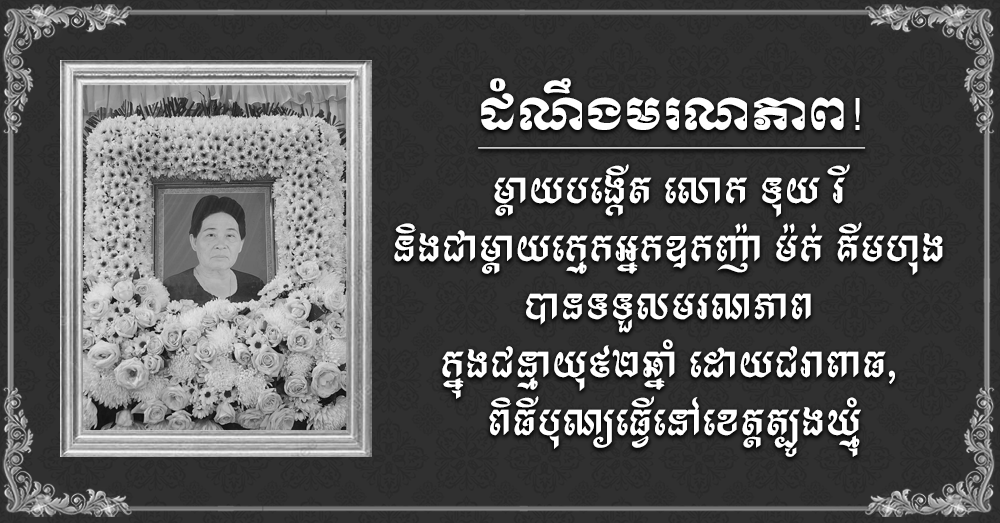 ដំណឹងមរណភាព! ម្ដាយបង្កើតលោក ទុយ រី និងជាម្ដាយក្មេកអ្នកឧកញ៉ា ម៉ក់ គីមហុង បានទទួលមរណភាព ក្នុងជន្មាយុ៩២ឆ្នាំ ដោយជរាពាធ, ពិធីបុណ្យធ្វើនៅខេត្តត្បូងឃ្មុំ