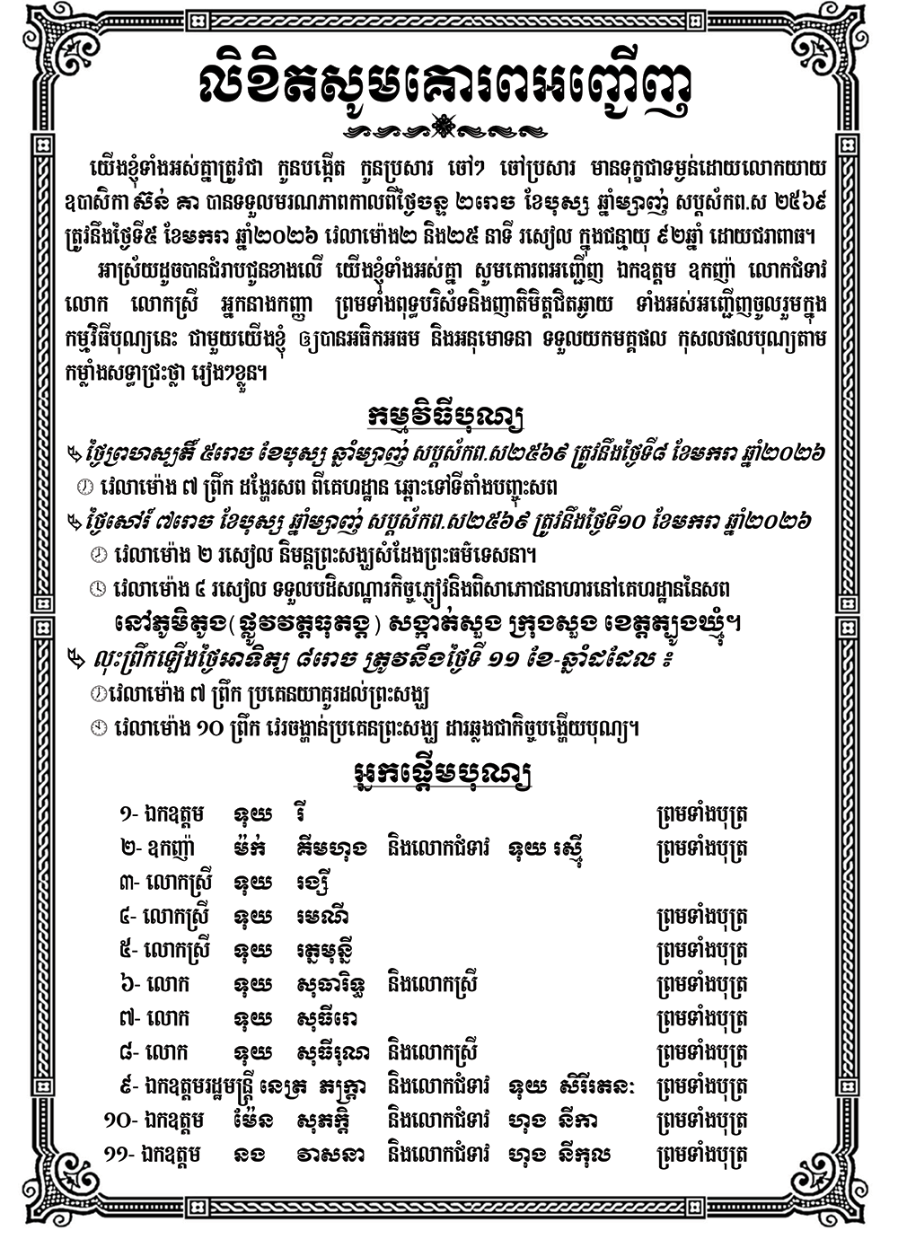 អាស្រ័យដូចបានគោរពជម្រាបជូនខាងលើ យើងខ្ញុំទាំងអស់គ្នា សូមគោរពអញ្ជើញ ឯកឧត្តម ឧកញ៉ា លោកជំទាវ លោក លោកស្រី អ្នកនាងកញ្ញា ព្រមទាំងពុទ្ធបរិស័ទ និងញាតិមិត្តជិតឆ្ងាយ ទាំងអស់អញ្ជើញចូលរួមក្នុងកម្មវិធីបុណ្យនេះ ជាមួយយើងខ្ញុំ និងអនុមោទនាទទួលយកមគ្គផល កុសលផលបុណ្យតាមកម្លាំងសទ្ធាជ្រះថ្លារៀងៗខ្លួន។