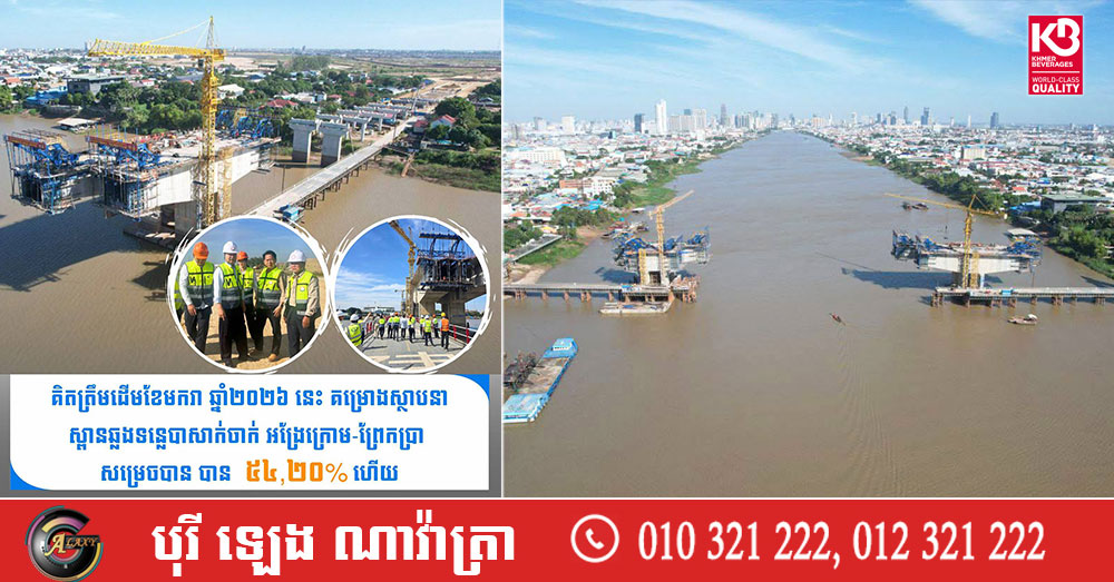 (ភ្នំពេញ)៖ លោក សួង ហេង រដ្ឋលេខាធិការ និងជានាយកគម្រោងសាងសង់ស្ពានឆ្លងទន្លេបាសាក់ចាក់អង្រែក្រោម-ព្រែកប្រា បានបញ្ជាក់ឱ្យដឹងថា គិតត្រឹមដើមខែមករា ឆ្នាំ២០២៦នេះ គម្រោងនេះសម្រេចបាន ៥៤.២០% ហើយ បន្ទាប់ពីសម្ពោធបើកការដ្ឋានសាងសង់នាថ្ងៃទី១៩ ខែកុម្ភៈ ឆ្នាំ២០២៤ ក្រោមអធិបតីភាពដ៏ខ្ពង់ខ្ពស់របស់សម្តេចមហាបវរធិបតី ហ៊ុន ម៉ាណែត នាយករដ្ឋមន្ត្រីកម្ពុជា។