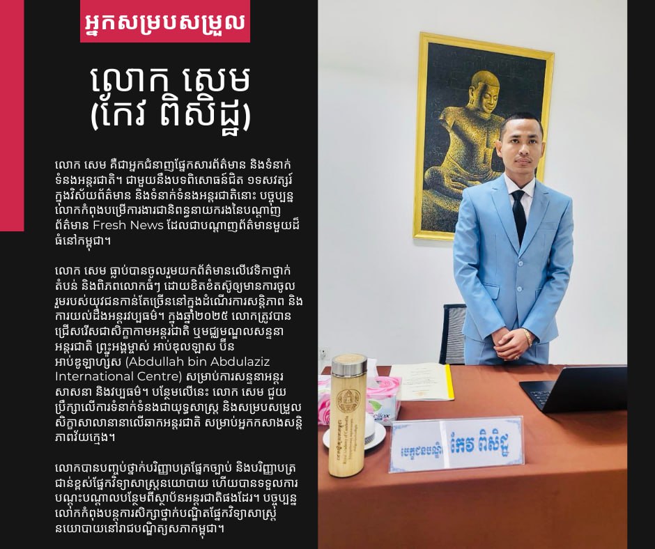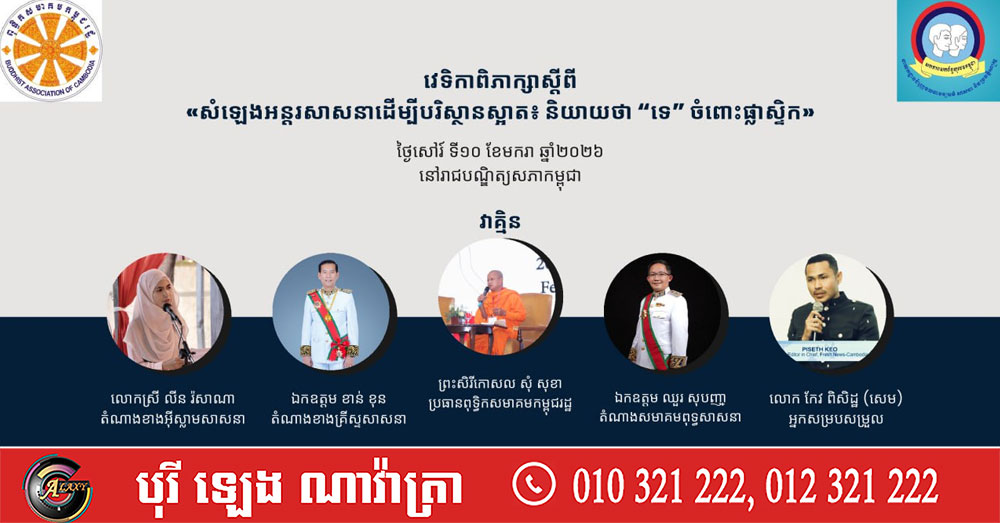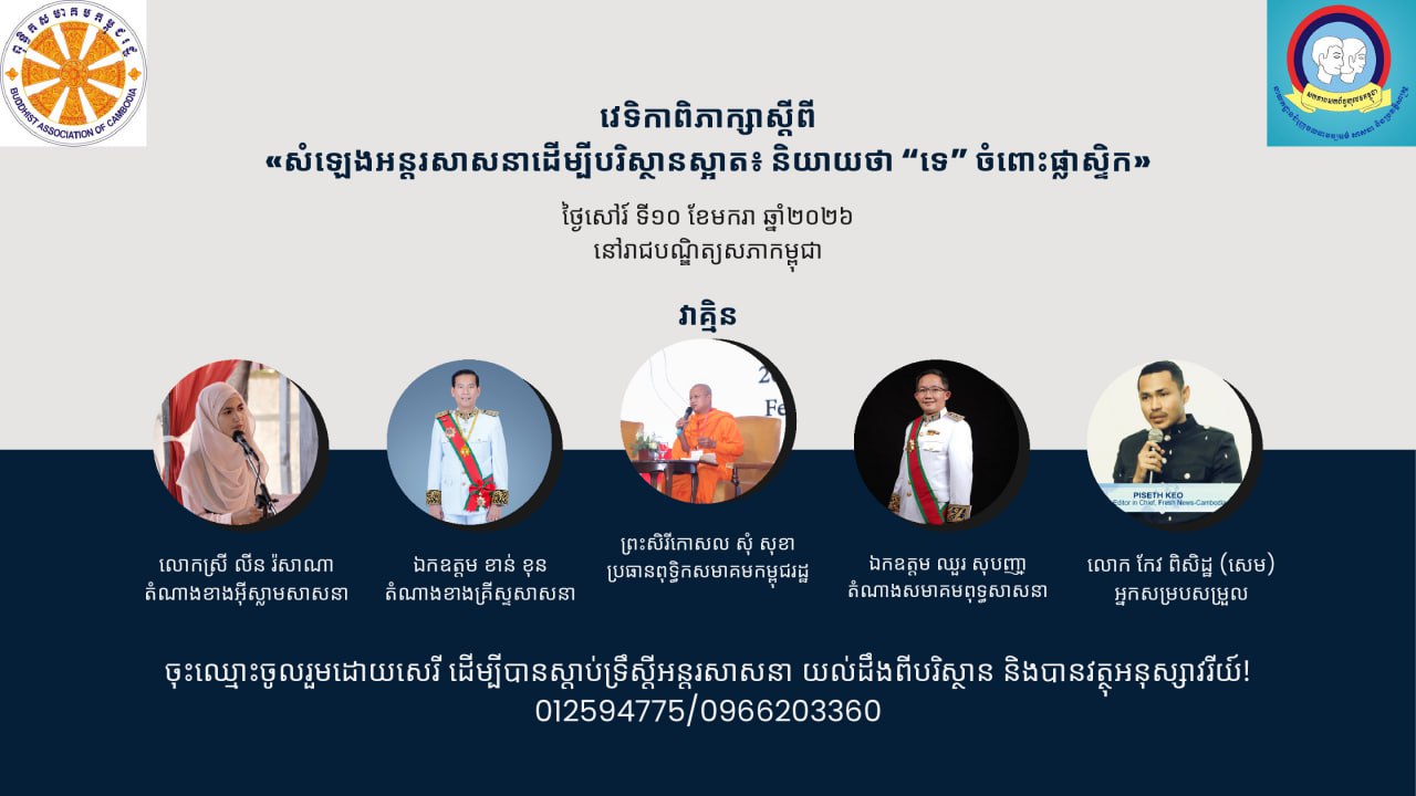 (ភ្នំពេញ)៖ គណៈកម្មការយុវពុទ្ធិកសមាគមកម្ពុជរដ្ឋ សហការជាមួយនាយកដ្ឋានជំរុញចលនាវប្បធម៌ សាសនា និងប្រវត្តិសាស្ត្រ នៃសហភាពសហព័ន្ធយុវជនកម្ពុជា នឹងរៀបចំវេទិកាពិភាក្សាស្តីពី «សំឡេងអន្តរសាសនាដើម្បីបរិស្ថានស្អាត៖ និយាយថា “ទេ” ចំពោះផ្លាស្ទិក - Interfaith Voices for a Clean Environment: Say “No” to Plastic”» នៅព្រឹកថ្ងៃសៅរ៍ ទី១០ ខែមករា ឆ្នាំ២០២៦ នៅសាលទន្លេសាប អគារខេមរវិទូ រាជបណ្ឌិត្យសភាកម្ពុជា និងផ្សាយផ្ទាល់លើបណ្តាញសង្គម។