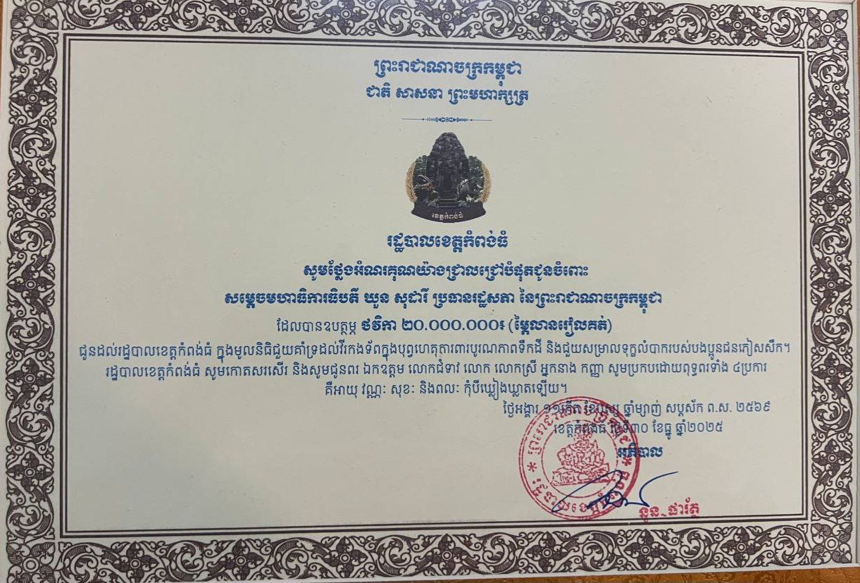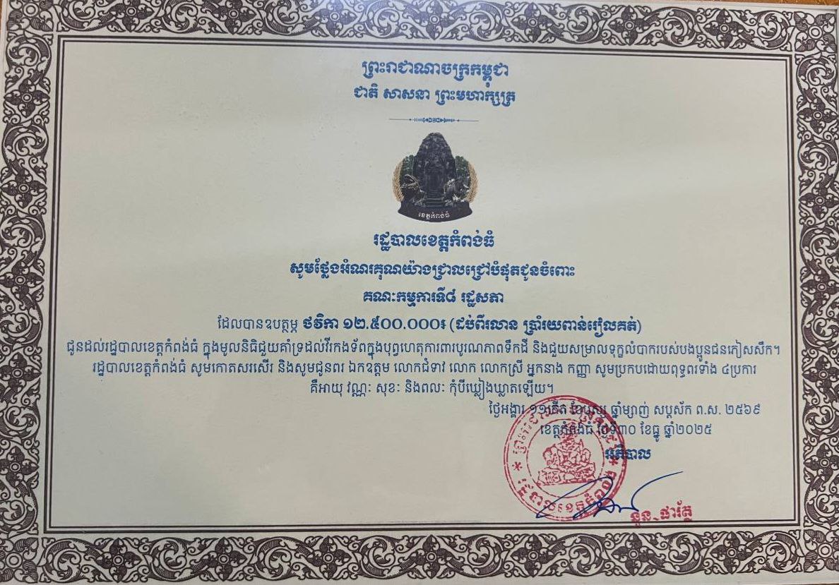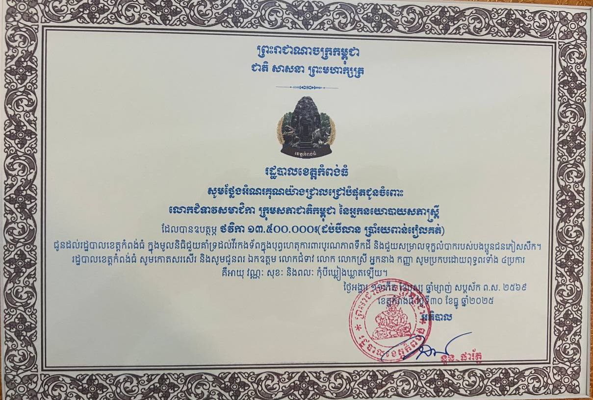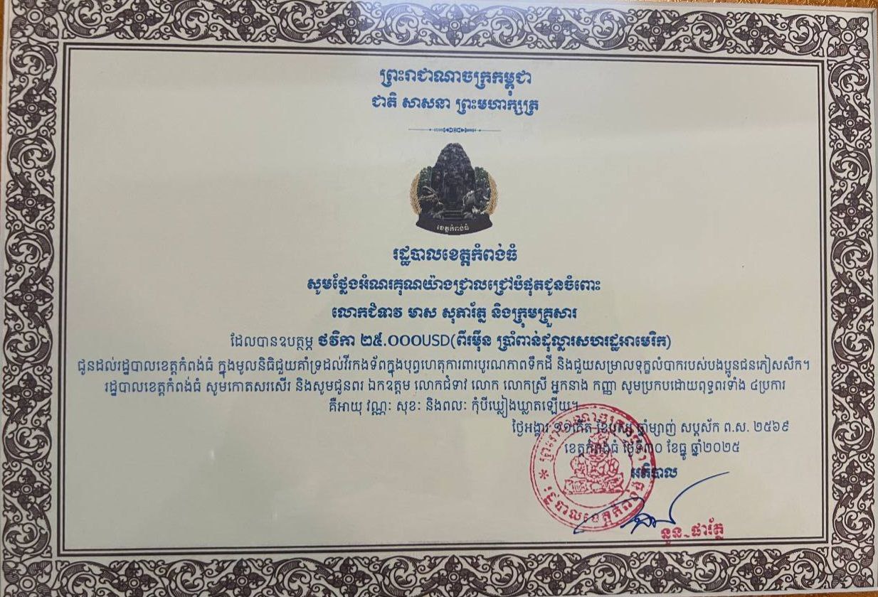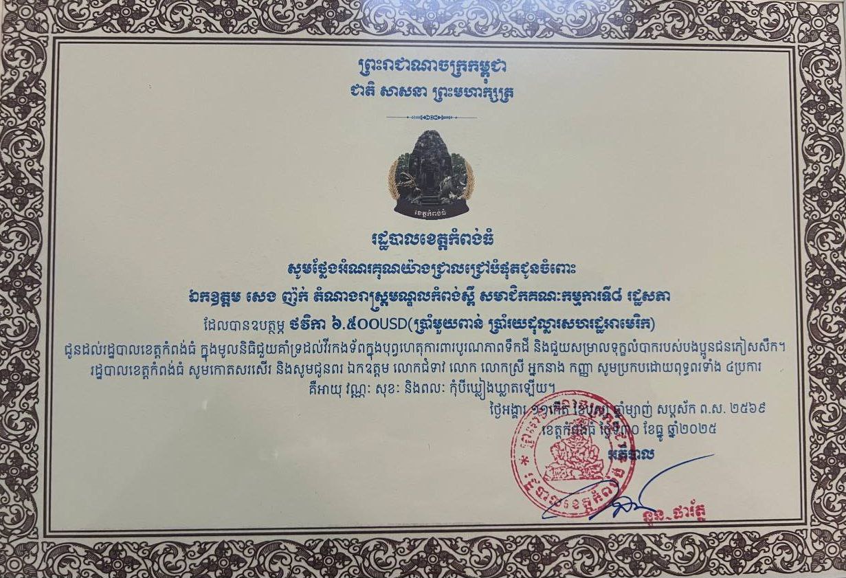 គូបញ្ជាក់ថាសម្ភារៈ និងថវិកាដែលបានផ្ដល់ជូនរដ្ឋបាលខេត្តកំពង់ធំមានចំនួន ៩២០គ្រួសារ ត្រូវបានបែងចែកជូនទៅស្រុកតាំងគោកចំនួន ៦៤៨គ្រួសារ ស្រុកកំពង់ស្វាយ ១០០គ្រួសារ ស្រុកប្រាសាទបល្ល័ង្ក ១០២គ្រួសារ ស្រុកសន្ទុក ២០គ្រួសារ និងស្រុកប្រាសាទសំបូរ ៥០គ្រួសារ៕