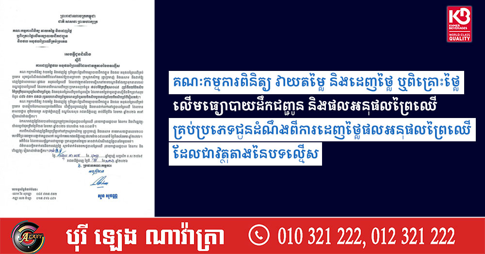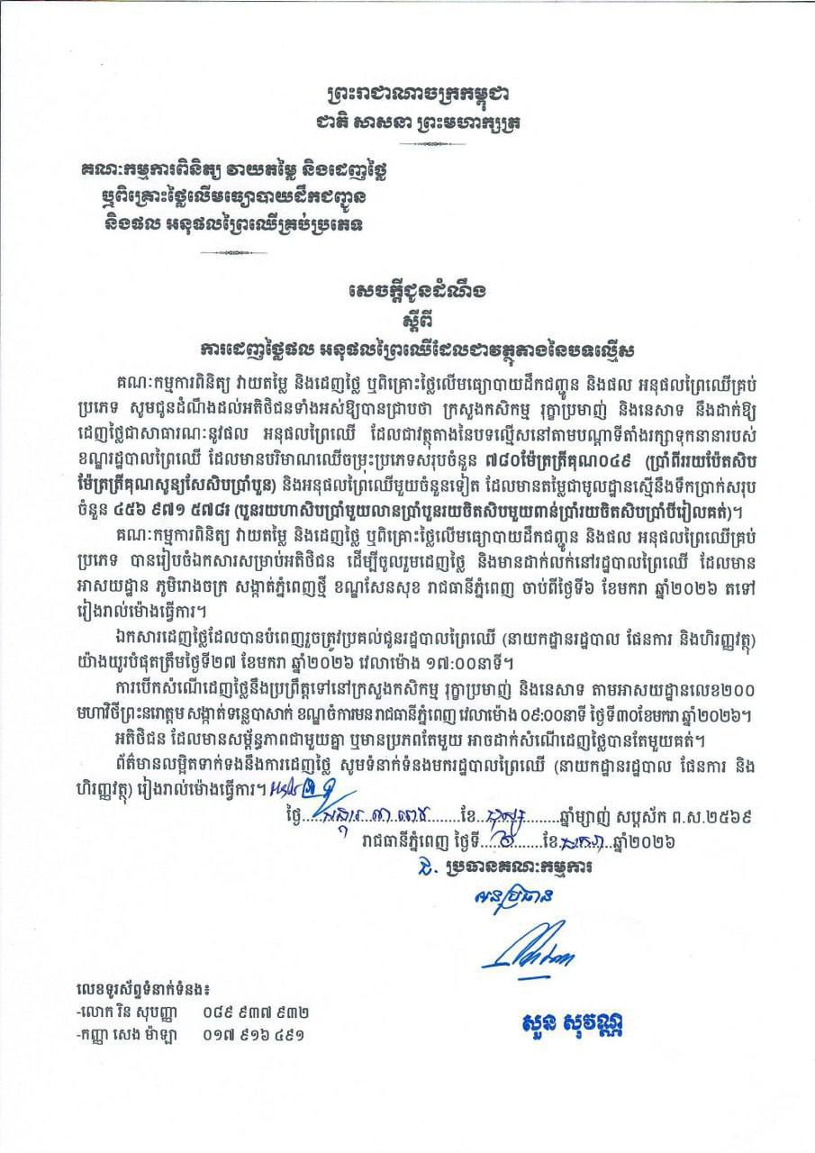 គណៈកម្មការពិនិត្យ វាយតម្លៃ និងដេញថ្លៃ ឬពិគ្រោះថ្លៃលើមធ្យោបាយដឹកជញ្ជូន និងផល អនុផលព្រៃឈើគ្រប់ប្រភេទ បានរៀបចំឯកសារសម្រាប់អតិថិជន ដើម្បីចូលរួមដេញថ្លៃ និងមានដាក់លក់នៅរដ្ឋបាលព្រៃឈើ ដែលមានអាសយដ្ឋាន ភូមិរោងចក្រ សង្កាត់ភ្នំពេញថ្មី ខណ្ឌសែនសុខ រាជធានីភ្នំពេញ ចាប់ពីថ្ងៃទី៦ ខែមករា ឆ្នាំ២០២៦ តទៅ រៀងរាល់ម៉ោងធ្វើការ។