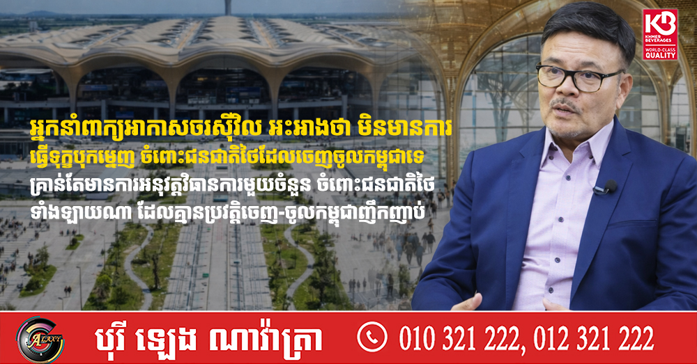 អ្នកនាំពាក្យអាកាសចរស៉ីវិល អះអាងថា មិនមានការធ្វើទុក្ខបុកម្នេញ ចំពោះជនជាតិថៃដែលចេញចូលកម្ពុជាទេ គ្រាន់តែមានការអនុវត្តវិធានការមួយចំនួន ចំពោះជនជាតិថៃទាំងឡាយណា ដែលគ្មានប្រវត្តិចេញ-ចូលកម្ពុជាញឹកញាប់ (Video inside)