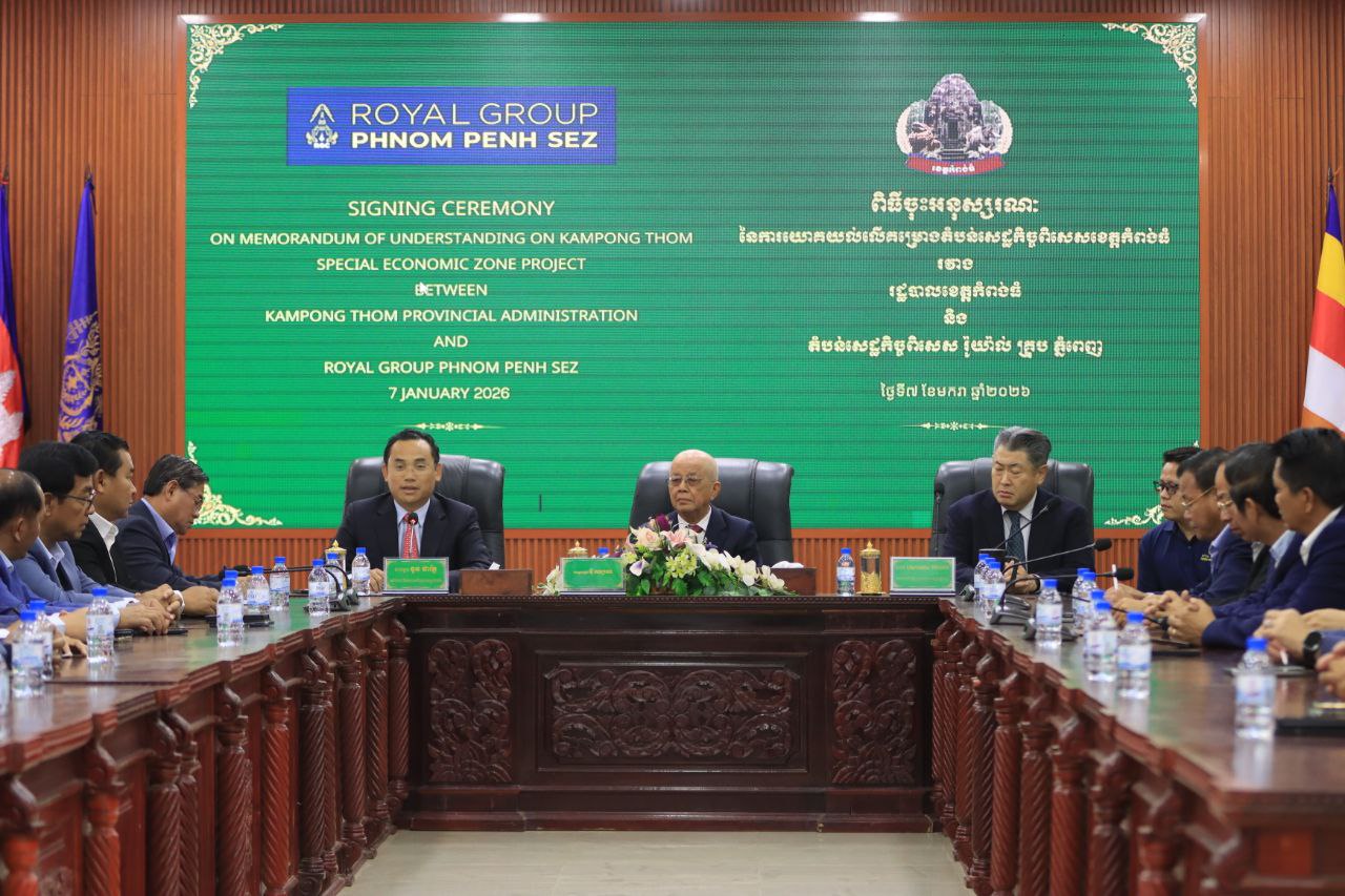 (កំពង់ធំ)៖ រដ្ឋបាលខេត្តកំពង់ធំ និងក្រុមហ៊ុនរ៉ូយ៉ាល់គ្រុបភ្នំពេញ អេសអ៉ីហ្សិត ម.ក. (Royal Group Phnom Penh SEZ Plc.) នាថ្ងៃទី៧ ខែមករា ឆ្នាំ២០២៦នេះ បានចុះអនុស្សរណៈនៃការយោគយល់គ្នា ស្តីពីការសិក្សាសមិទ្ធិលទ្ធភាពក្នុងការបង្កើតសួនកសិ-ឧស្សាហកម្មក្នុងខេត្តកំពង់ធំ សម្រាប់ការកែឆ្នៃកសិផលនានា នៅលើផ្ទៃដីប្រមាណ ៣០០ហិកតា ដែលស្ថិតនៅក្នុងខេត្តកំពង់ធំ ។