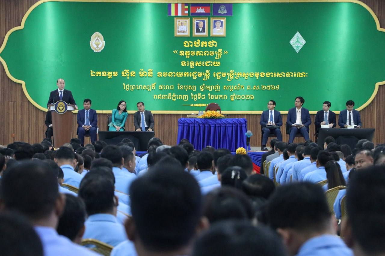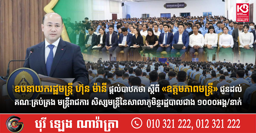 ឧបនាយករដ្ឋមន្ត្រី ហ៊ុន ម៉ានី ផ្តល់បាឋកថា ស្តីពី «ឧត្តមភាពមន្ត្រី» ជូនដល់គណៈគ្រប់គ្រង មន្ត្រីរាជការ សិស្សមន្ត្រីនៃសាលាភូមិន្ទរដ្ឋបាលជាង ១០០០អង្គ/នាក់