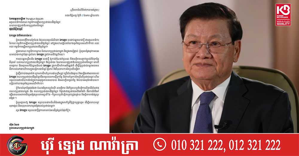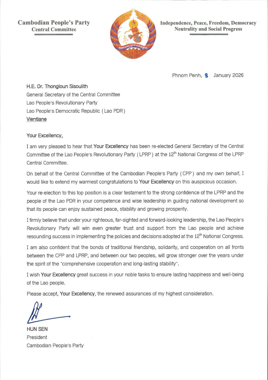 (ភ្នំពេញ)៖ សម្ដេចតេជោ ហ៊ុន សែន ប្រធានគណបក្សប្រជាជនកម្ពុជា បានផ្ញើសារអបអរសាទរ លោកបណ្ឌិត Thongloun Sisoulith ដែលបានជាប់ឆ្នោតសាជាថ្មី ជាអគ្គលេខាធិការនៃគណៈកម្មាធិការមជ្ឈិមបក្សប្រជាជនបដិវត្តន៍ឡាវ នៅក្នុងមហាសន្និបាតតំណាងទូទាំងប្រទេសលើកទី១២ របស់គណៈកម្មាធិការមជ្ឈិមបក្សប្រជាជនបដិវត្តន៍ឡាវ។