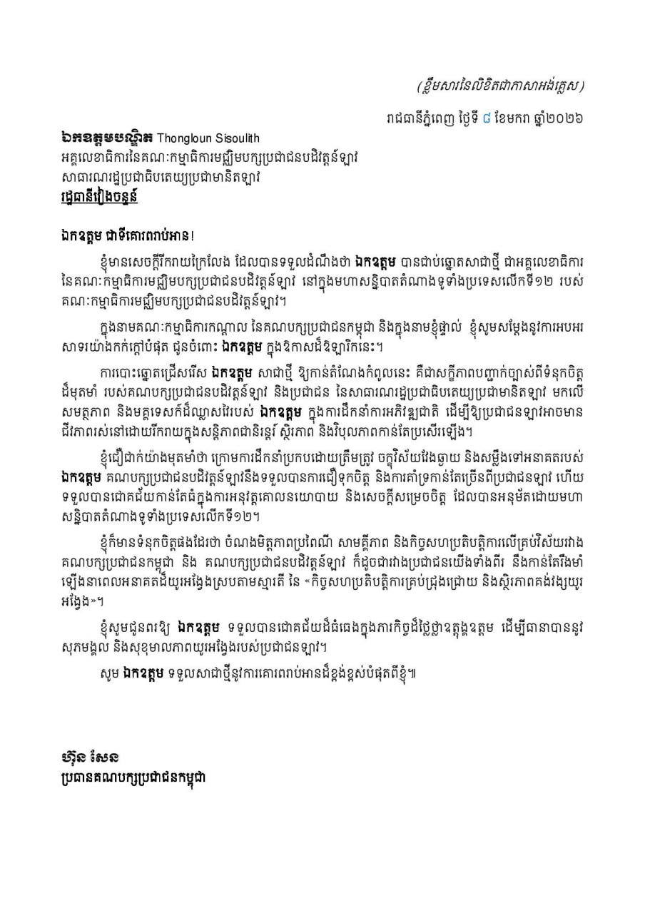 ក្នុងសារលិខិតរបស់សម្ដេចតេជោ ហ៊ុន សែន បានសរសេរថា «ខ្ញុំមានសេចក្តីរីករាយក្រៃលែង ដែលបានទទួលដំណឹងថា ឯកឧត្តម បានជាប់ឆ្នោតសាជាថ្មី ជាអគ្គលេខាធិការ នៃគណៈកម្មាធិការមជ្ឈិមបក្សប្រជាជនបដិវត្តន៍ឡាវ នៅក្នុងមហាសន្និបាតតំណាងទូទាំងប្រទេសលើកទី១២ របស់ គណៈកម្មាធិការមជ្ឈិមបក្សប្រជាជនបដិវត្តន៍ឡាវ។