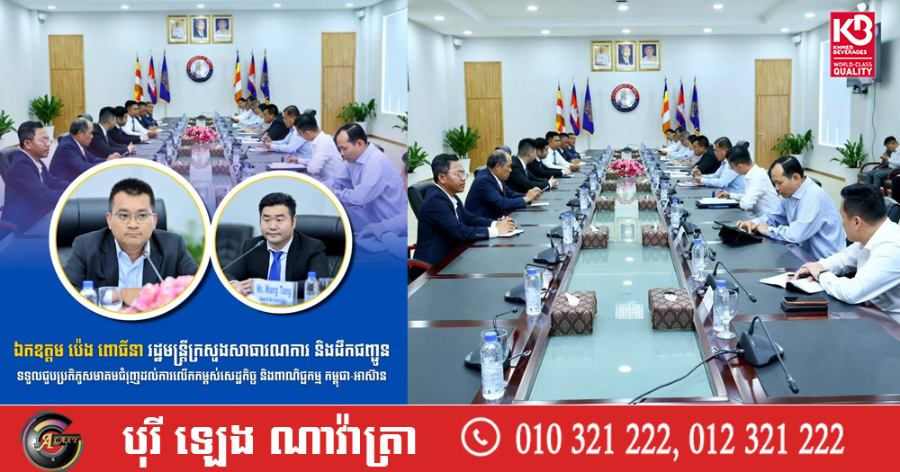 (ភ្នំពេញ)៖ លោក ប៉េង ពោធិ៍នា រដ្ឋមន្រ្តីក្រសួងសាធារណការ និងដឹកជញ្ជូន នារសៀលថ្ងៃទី៨ ខែមករា ឆ្នាំ២០២៦នេះ បានអនុញ្ញាតិឱ្យប្រតិភូសមាគមជំរុញដល់ការលើកកម្ពស់សេដ្ឋកិច្ច និងពាណិជ្ជកម្ម កម្ពុជា-អាស៊ាន ចូលជួបសម្តែងការគួរសម និងពិភាក្សាការងារ ដោយមានការចូលរួមពីថ្នាក់ដឹកនាំក្រសួង និងមន្រ្តីពាក់ព័ន្ធ។