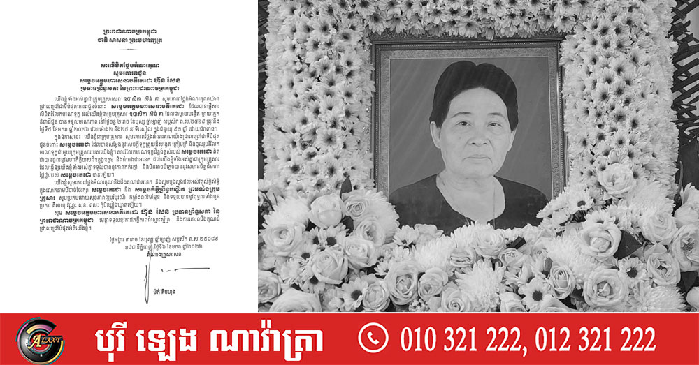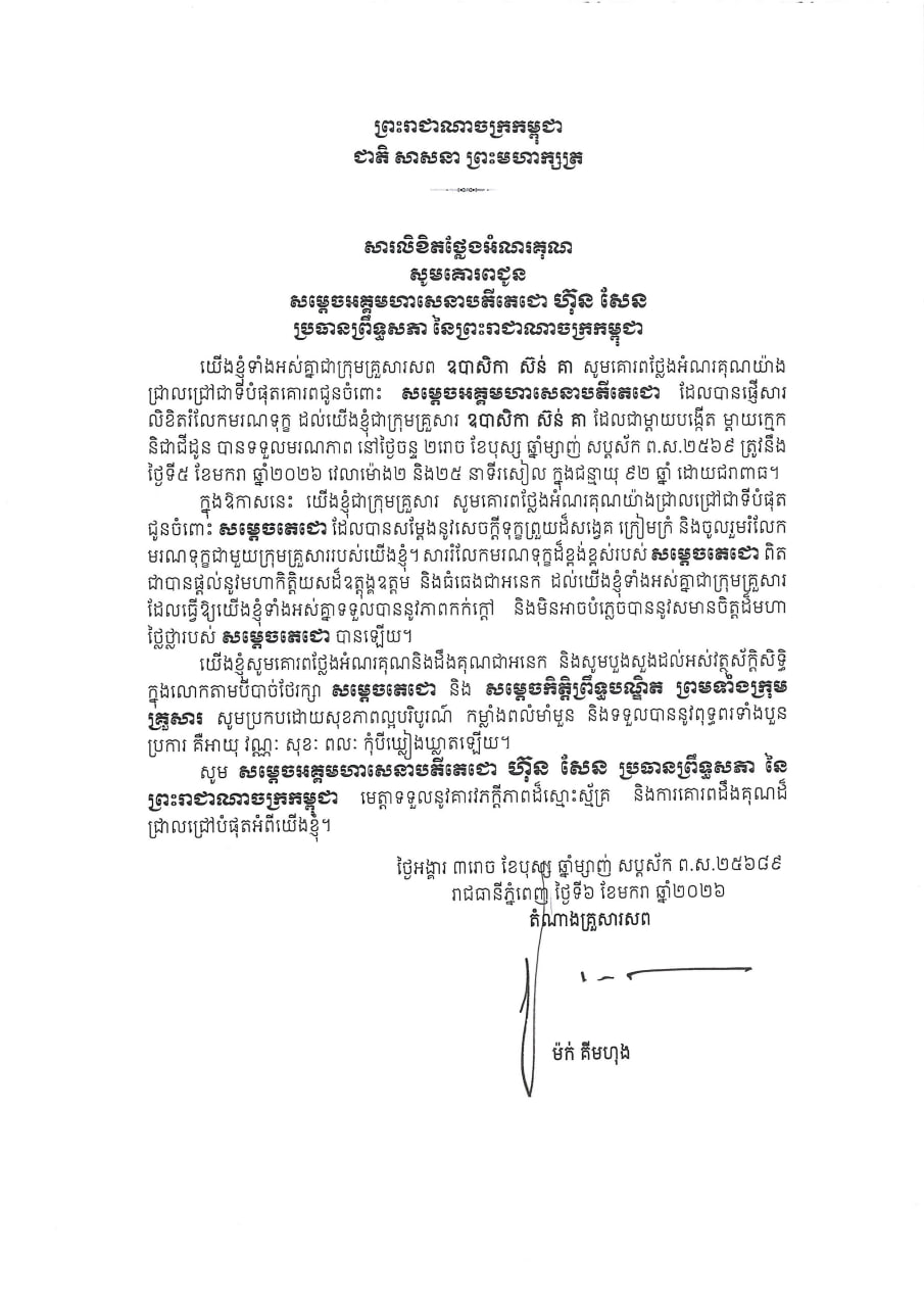 (ភ្នំពេញ)៖ អ្នកឧកញ៉ា ម៉ក់ គីមហុង តំណាងក្រុមគ្រួសារនៃសព បានចេញសារលិខិតគោរពថ្លែងអំណរគុណ ជូនចំពោះសម្តេចតេជោ ហ៊ុន សែន ប្រធានព្រឹទ្ធសភា ដែលបានផ្ញើសារលិខិតចូលរួមរំលែកមរណទុក្ខចំពោះមរណភាពរបស់ឧបាសិកា ស៊ន់ គា ត្រូវជាម្តាយក្មេក បានទទួលមរណភាពកាលពីថ្ងៃទី៥ ខែមករា ឆ្នាំ២០២៦ វេលាម៉ោង២ និង២៥ នាទីរសៀល ក្នុងជន្មាយុ ៩២ឆ្នាំ ដោយជរាពាធ។
