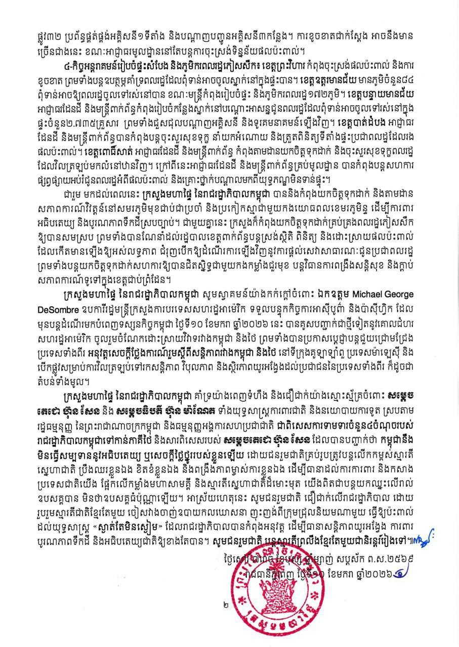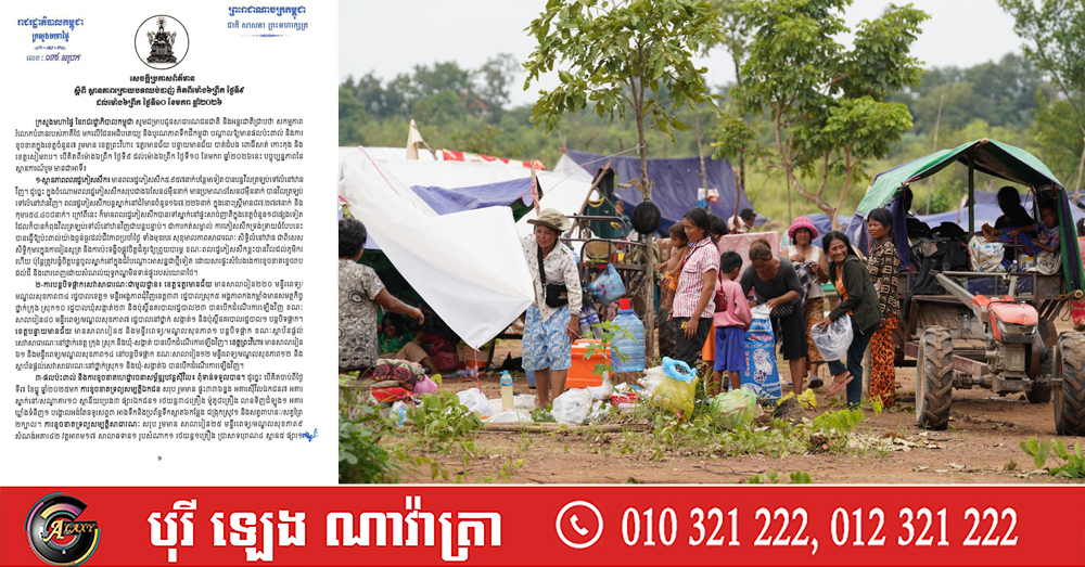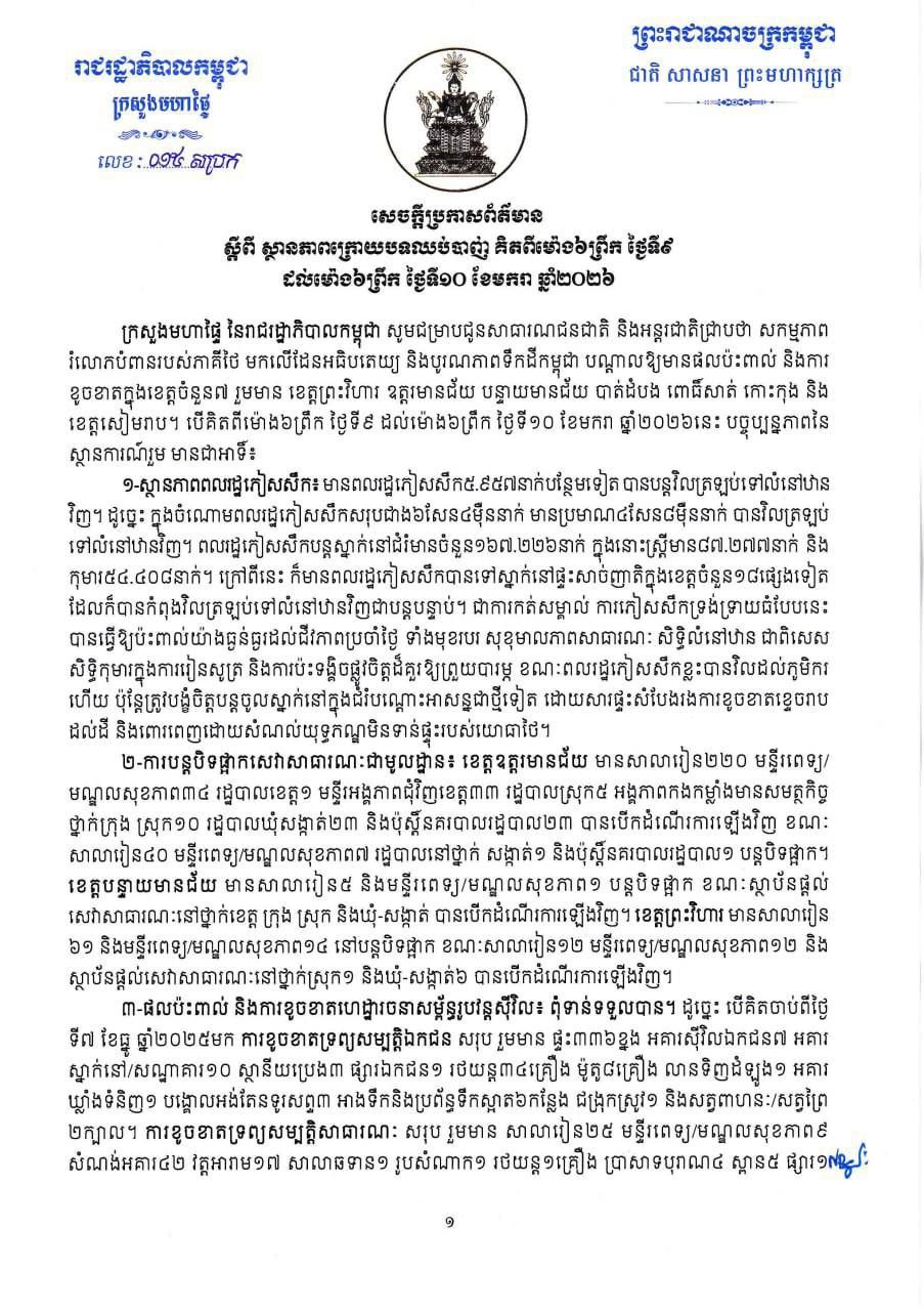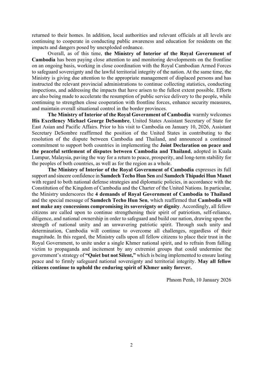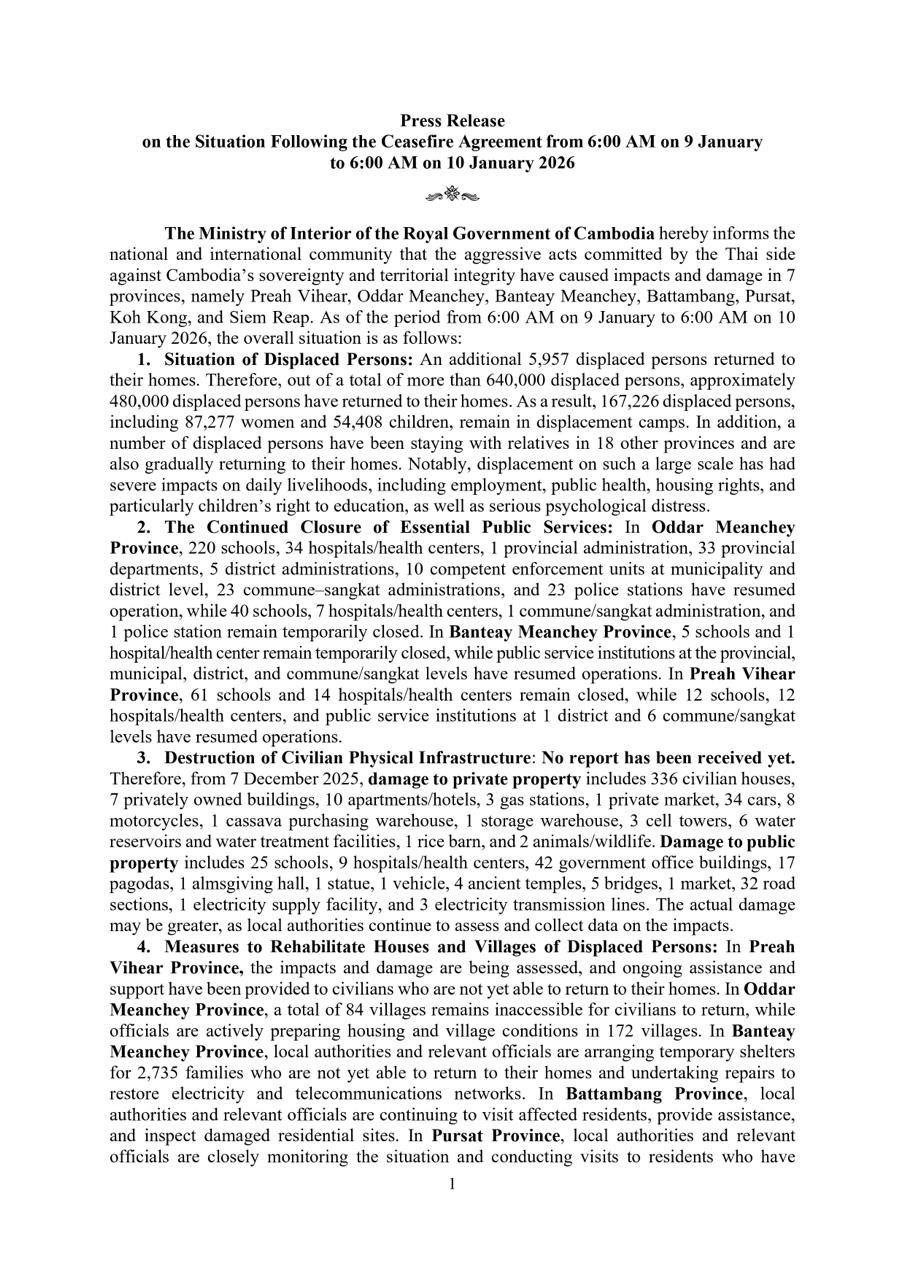 (ភ្នំពេញ)៖ ក្រសួងមហាផ្ទៃ នៅព្រឹកថ្ងៃទី១០ ខែមករា ឆ្នាំ២០២៦នេះ បានឲ្យដឹងថា គិតចាប់ពីម៉ោង៦ព្រឹក ថ្ងៃទី៩ ខែមករា ដល់ម៉ោង៦ព្រឹក ថ្ងៃទី១០ ខែមករា ឆ្នាំ២០២៦នេះ មានពលរដ្ឋភៀសសឹក៥,៩៥៧នាក់បន្ថែមទៀត បានបន្តវិលត្រឡប់ទៅលំនៅឋានវិញ ដូច្នេះក្នុងចំណោមពលរដ្ឋភៀសសឹកសរុបជាង៦សែន៤ម៉ឺននាក់ មានប្រមាណ៤សែន៨ម៉ឺននាក់ បានវិលត្រឡប់ទៅលំនៅឋានវិញ។