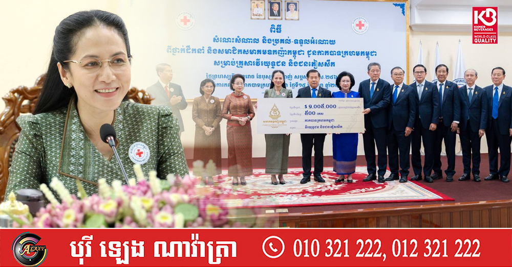 (ភ្នំពេញ)៖ លោកជំទាវបណ្ឌិត ពេជ ចន្ទមុន្នី ហ៊ុនម៉ាណែត អនុប្រធានអចិន្ដ្រៃយ៍ កាកបាទក្រហមកម្ពុជា តំណាងដ៏ខ្ពង់ខ្ពស់ សម្តេចកិត្តិព្រឹទ្ធបណ្ឌិត ប៊ុន រ៉ានី ហ៊ុនសែន ប្រធានកាកបាទក្រហមកម្ពុជា អញ្ជើញជាអធិបតីប្រគល់ និងទទួលអំណោយជាថវិកាចំនួន ១,០០៥,០០០ដុល្លាអាមេរិក និងទឹកបរិសុទ្ធ ៥០០កេស ពីថ្នាក់ដឹកនាំ និងសមាជិកសមាគមឧកញ៉ាកម្ពុជា ដែលដឹកនាំដោយលោកអ្នកឧកញ៉ា លី ហួរ អនុប្រធានសមាគមឧកញ៉ាកម្ពុជា ជូនកាកបាទក្រហមកម្ពុជា សម្រាប់ជួយដល់គ្រួសារវីរយុទ្ធជន និងប្រជាជនភៀសសឹក។