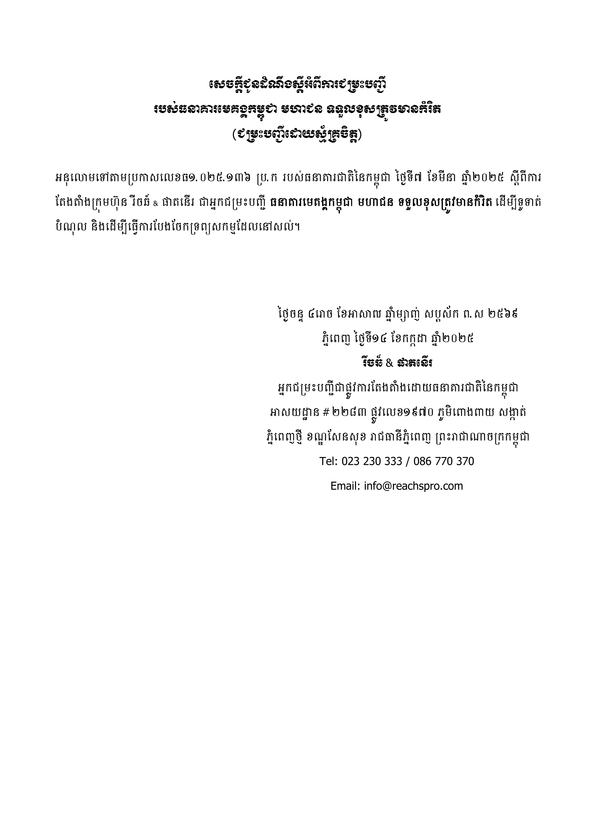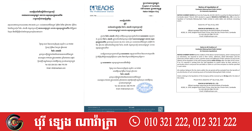 (ភ្នំពេញ)៖ សូមជម្រាបជូនដល់ម្ចាស់បំណុលទាំងអស់ របស់ធនាគារមេគង្គកម្ពុជា មហាជនទទួលខុសត្រូវមានកម្រិត (CMB) ឱ្យបានជ្រាបថា យើងខ្ញុំ បានធ្វើការប្រកាសជូនដំណឹងជាច្រើនលើកមកហើយតាមរយៈប្រព័ន្ធផ្សព្វផ្សាយផ្សេងៗ។ ដោយឡែក ដើម្បីផ្តល់ឱកាសជូនម្ចាស់បំណុលដែលមិនទទួលបានដំណឹង និងមិនទាន់បានដាក់ពាក្យស្នើសុំទាមទារបំណុល យើងខ្ញុំ សូមធ្វើការក្រើនរំលឹក និងជូនដំណឹងបន្ថែមទៀត។ អាស្រ័យហេតុនេះ សូមម្ចាស់បំណុលទាំងអស់ដែលមិនទាន់ដាក់ពាក្យស្នើសុំ មេត្តាដាក់ពាក្យជាលាយលក្ខណ៏អក្សរដោយបញ្ជាក់ឱ្យបានច្បាស់អំពីលក្ខណៈបំណុល ចំនួនទឹកប្រាក់ដែលនៅសល់ និងភ្ជាប់មកជាមួយឯកសារគាំទ្រពាក់ព័ន្ធ (ដូចជា បញ្ជីគណនី ឬភស្តុតាងផ្សេងៗ) ក្នុងរយៈពេល ៣០ថ្ងៃនៃថ្ងៃធ្វើការ ដោយគិតចាប់ពីកាលបរិច្ឆេទនៃការផ្សាយសេចក្តីក្រើនរំលឹក និងជូនដំណឹងជាថ្មីនេះតទៅ។