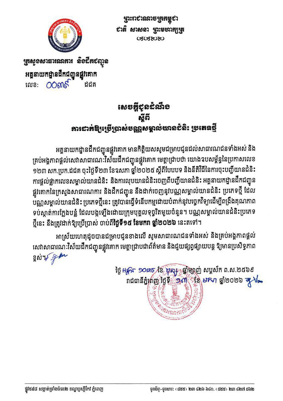ការចេញបណ្ណសម្គាល់ថ្មី គឺសម្រាប់ការចុះបញ្ជីយានជំនិះថ្មី ដោយចាប់អនុវត្តពីថ្ងៃទី១៥ ខែមករា ឆ្នាំ២០២៦ តទៅ ចំពោះបណ្ណចាស់បងប្អូននៅបន្តប្រើប្រាស់បានធម្មតា។ ក្នុងករណីបងប្អូនប្រជាពលរដ្ឋចង់បានបណ្ណប្រភេទថ្មី អាចដាក់ពាក្យស្នើសុំប្តូរនៅតាមទីតាំងផ្តល់សេវាសាធារណៈរបស់ក្រសួងសាធារណការ និងដឹកជញ្ជូនរៀងរាល់ម៉ោងបំពេញការងារ៕