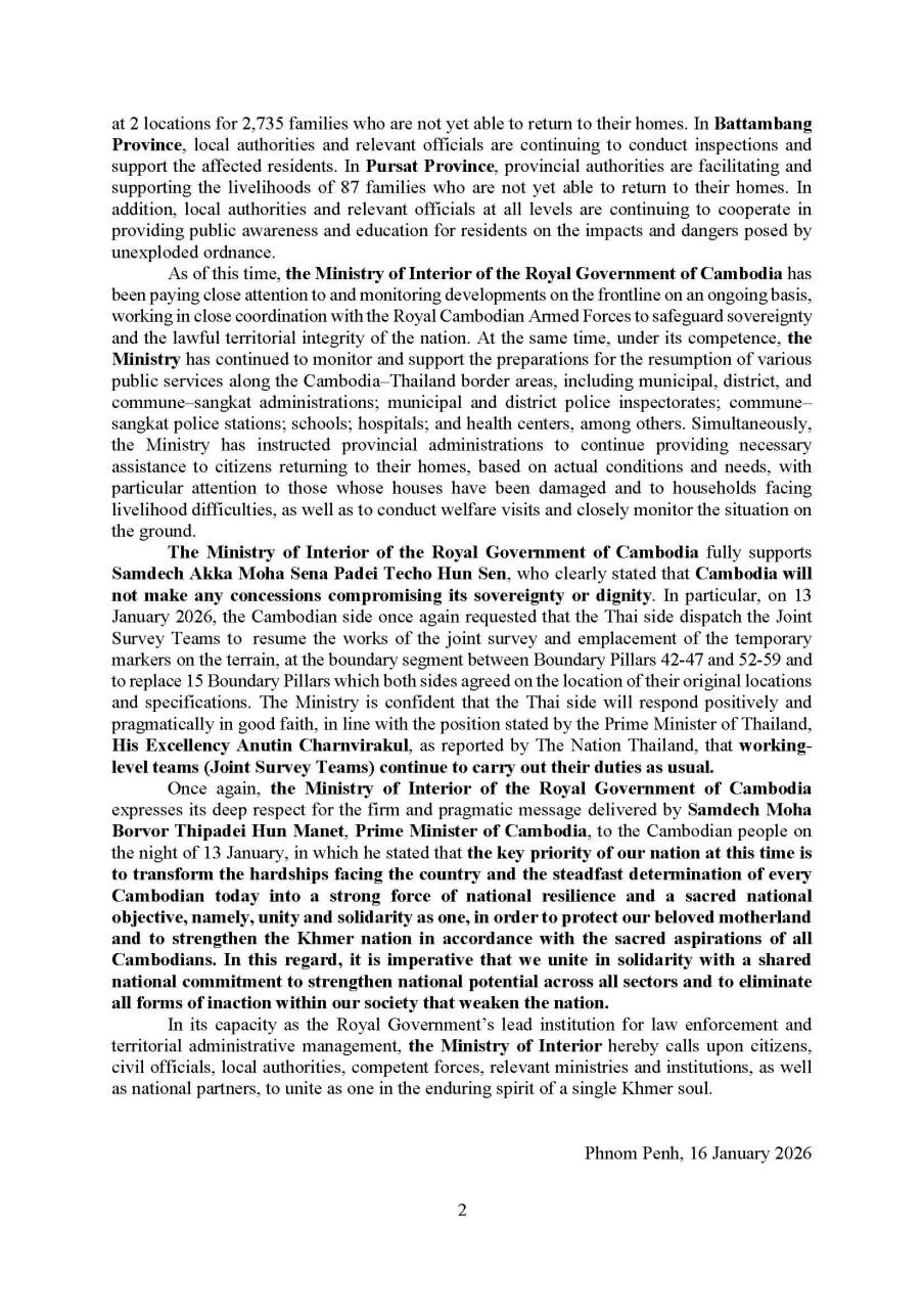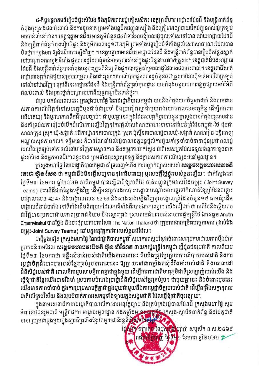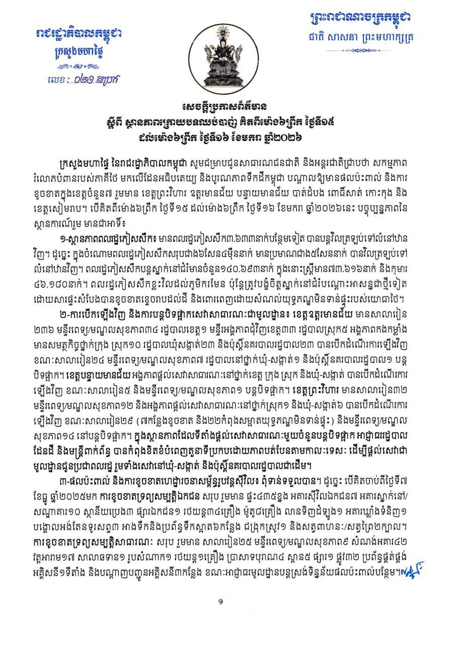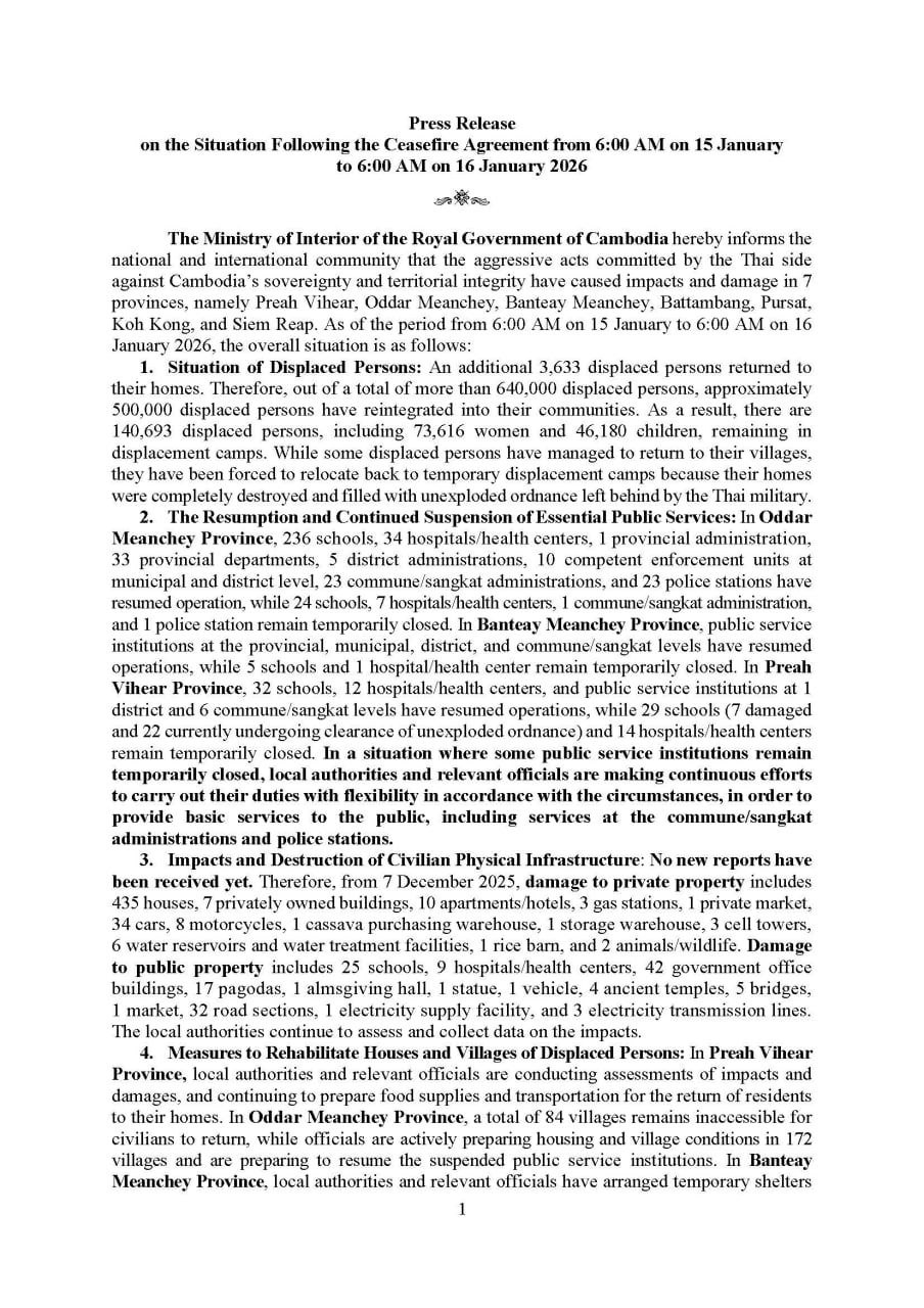 ក្រសួងមហាផ្ទៃ៖ គិតត្រឹមថ្ងៃទី១៦ ខែមករា ឆ្នាំ២០២៦ ពលរដ្ឋភៀសសឹកជាង៥សែននាក់ បានវិលត្រឡប់ទៅលំនៅឋានវិញ ខណៈពលរដ្ឋជាង ១៤ម៉ឺនាក់ទៀត បន្តស្នាក់នៅជំរំបណ្តោះអាសន្ន (Video inside)