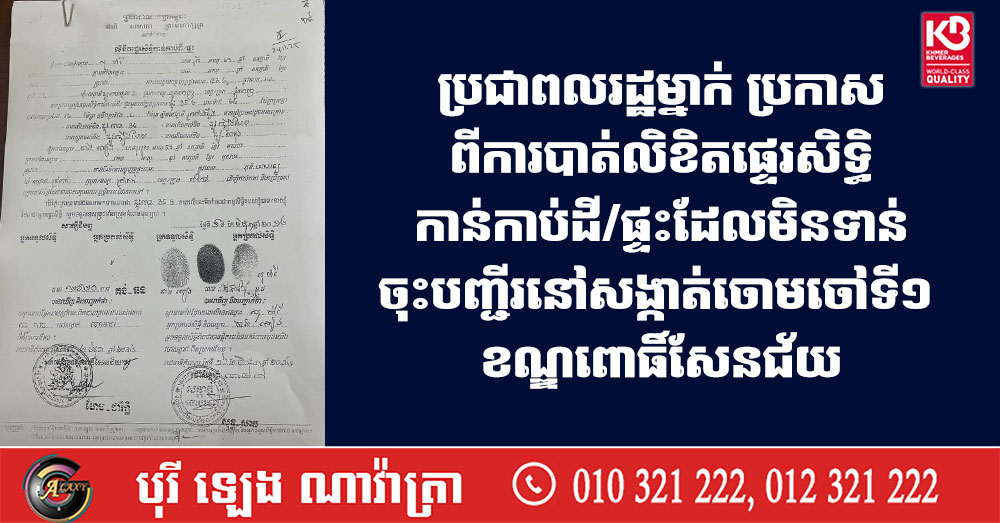 ប្រជាពលរដ្ឋម្នាក់ ប្រកាសពីការបាត់លិខិតផ្ទេរសិទ្ធិកាន់កាប់ដី/ផ្ទះដែលមិនទាន់ចុះបញ្ជីរនៅសង្កាត់ចោមចៅទី១ ខណ្ឌពោធិ៍សែនជ័យ