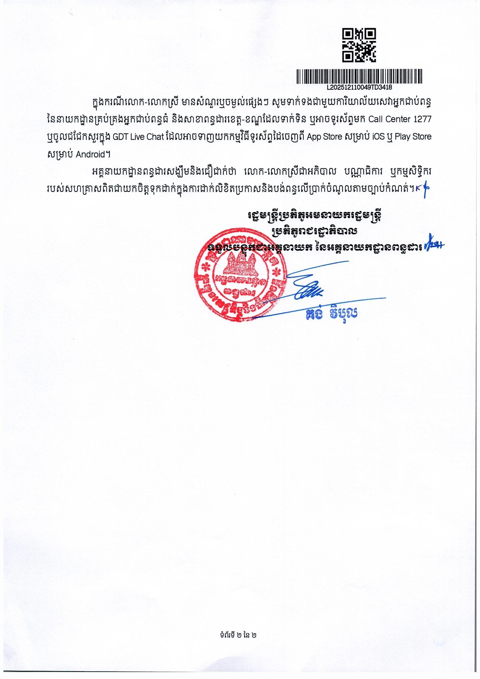 ក្នុងករណីលោក-លោកសី មានសំណួរឬចម្ងល់ផ្សេងៗ សូមទាក់ទងជាមួយការិយាល័យសេវា អ្នកជាប់ពន្ធនៃនាយកដ្ឋានគ្រប់គ្រងអ្នកជាប់ពន្ធធំ និងសាខាពន្ធដារខេត្ត-ខណ្ឌដែលទាក់ទិន ឬអាចទូរស័ព្ទមក Call Center 1277 ឬចូលជជែកសួរក្នុង GDT Live Chat ដែលអាចទាញយកកម្មវិធីទូរស័ព្ទដៃចេញពី App Store សម្រាប់ iOS ឬ Play Store