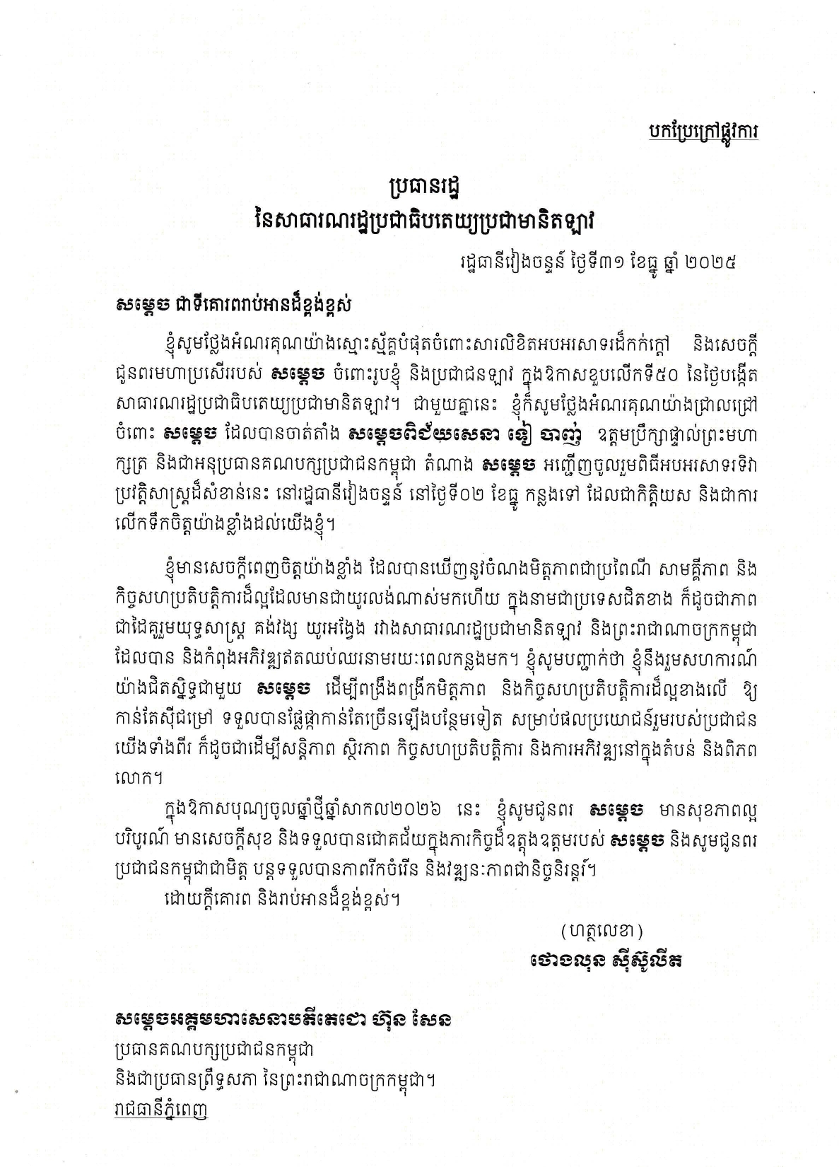 ក្នុងឱកាសបុណ្យចូលឆ្នាំថ្មីឆ្នាំសាកល២០២៦នេះ ខ្ញុំសូមជូនពរ សម្តេច មានសុខភាពល្អ បរិបូរណ៍ មានសេចក្តីសុខ និងទទួលបានជោគជ័យក្នុងភារកិច្ចដ៏ឧត្តុងឧត្តមរបស់ សម្តេច និងសូមជូនពរ ប្រជាជនកម្ពុជាជាមិត្ត បន្តទទួលបានភាពរីកចំរើន និងវឌ្ឍនៈភាពជានិច្ចនិរន្តរ៍»៕
