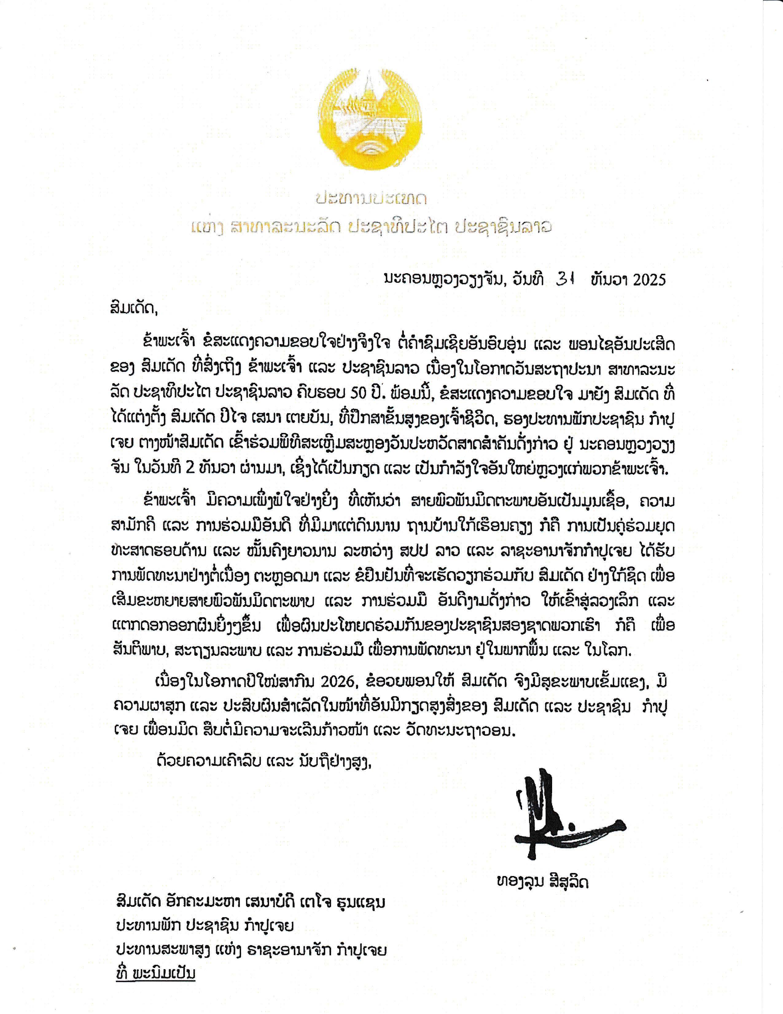 ក្នុងសារលិខិត បានសរសេរថា «ខ្ញុំសូមថ្លែងអំណរគុណយ៉ាងស្មោះស្ម័គ្របំផុតចំពោះសារលិខិតអបអរសាទរដ៏កក់ក្តៅ និងសេចក្តី ជូនពរមហាប្រសើររបស់ សម្តេចចំពោះរូបខ្ញុំ និងប្រជាជនឡាវ ក្នុងឱកាសខួបលើកទី៥០ នៃថ្ងៃបង្កើត សាធារណរដ្ឋប្រជាធិបតេយ្យប្រជាមានិតឡាវ។