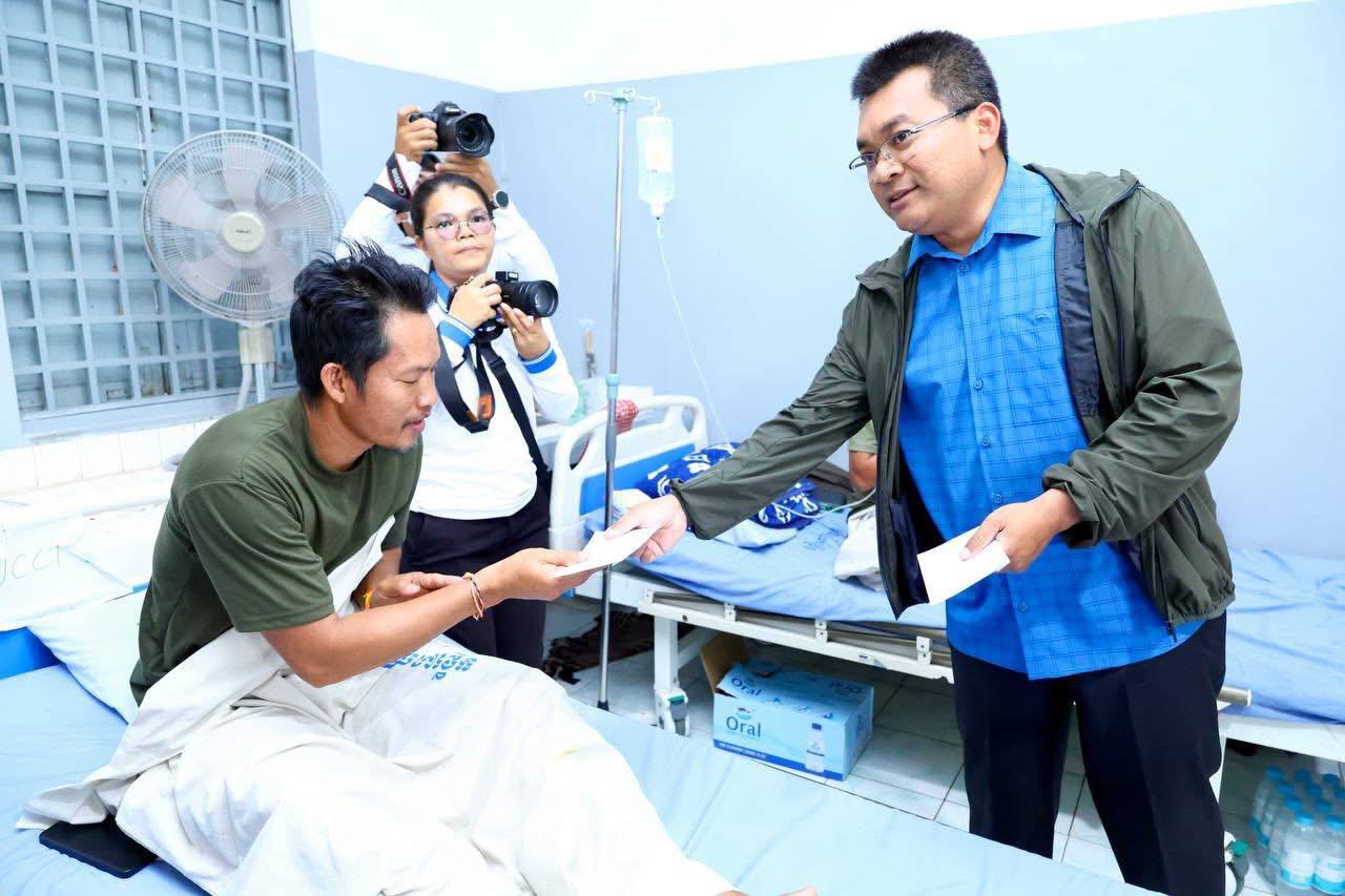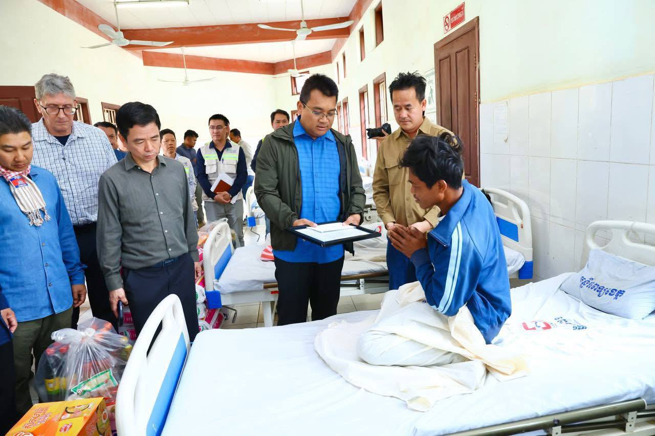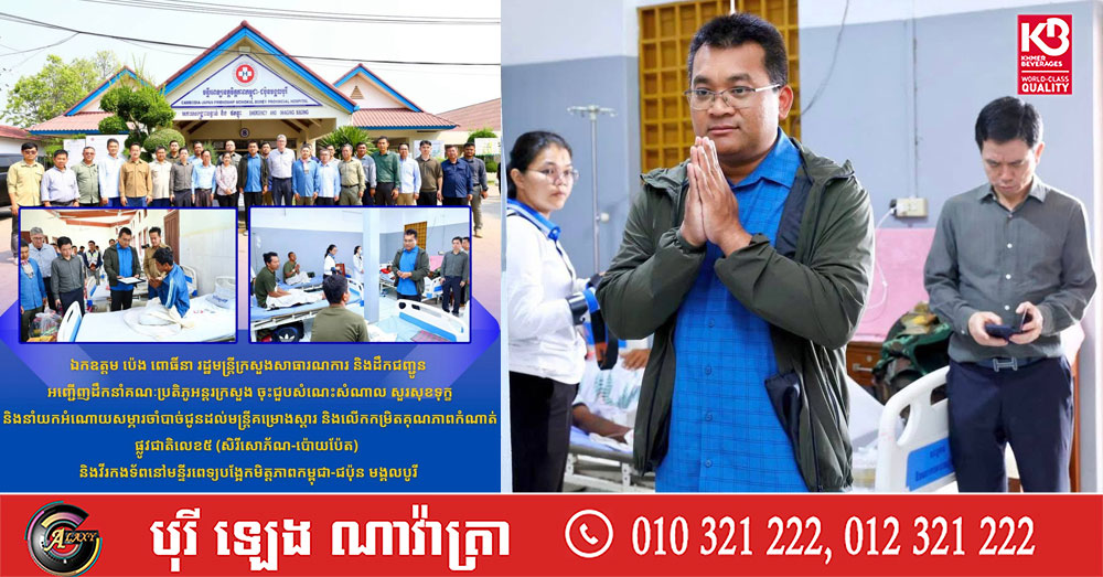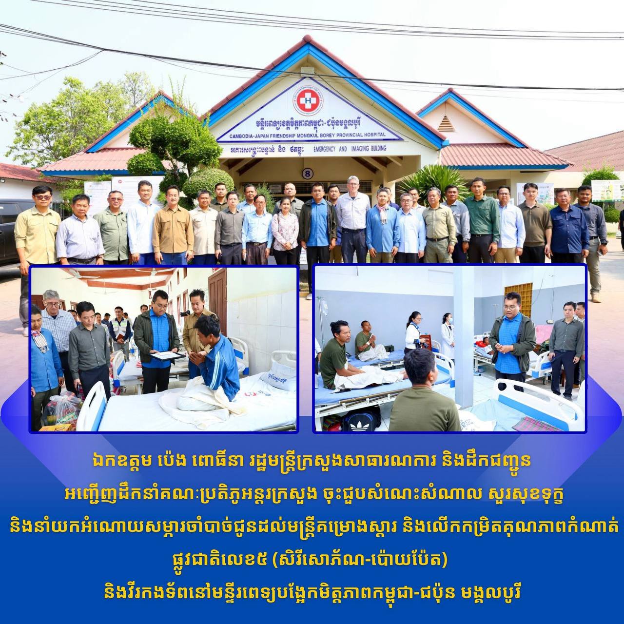 (បន្ទាយមានជ័យ)៖ លោក ប៉េង ពោធិ៍នា រដ្ឋមន្ត្រីក្រសួងសាធារណការ និងដឹកជញ្ជូន នាព្រឹកថ្ងៃទី១៧ ខែមករា ឆ្នាំ២០២៦នេះ បានដឹកនាំគណៈប្រតិភូអន្តរក្រសួង និងដោយមានការចូលរួមពីតំណាងទីភ្នាក់ងារសហប្រតិបត្តិការអន្តរជាតិនៃប្រទេសជប៉ុន (JICA) ចុះជួបសំណេះសំណាល សួរសុខទុក្ខ និងនាំយកអំណោយសម្ភារចាំបាច់ជូនដល់មន្ត្រីគម្រោងស្តារ និងលើកកម្រិតគុណភាពកំណាត់ផ្លូវជាតិលេខ៥ (សិរីសោភ័ណ-ប៉ោយប៉ែត) ចំនួន ២គ្រួសារ និងវីរកងទ័ពចំនួន ៧នាក់ នៅមន្ទីរពេទ្យបង្អែកមិត្តភាពកម្ពុជា-ជប៉ុន មង្គលបូរី ខេត្តបន្ទាយមានជ័យ ដែលរងគ្រោះដោយសារថៃឈ្លានពាន នាពេលកន្លងមក។