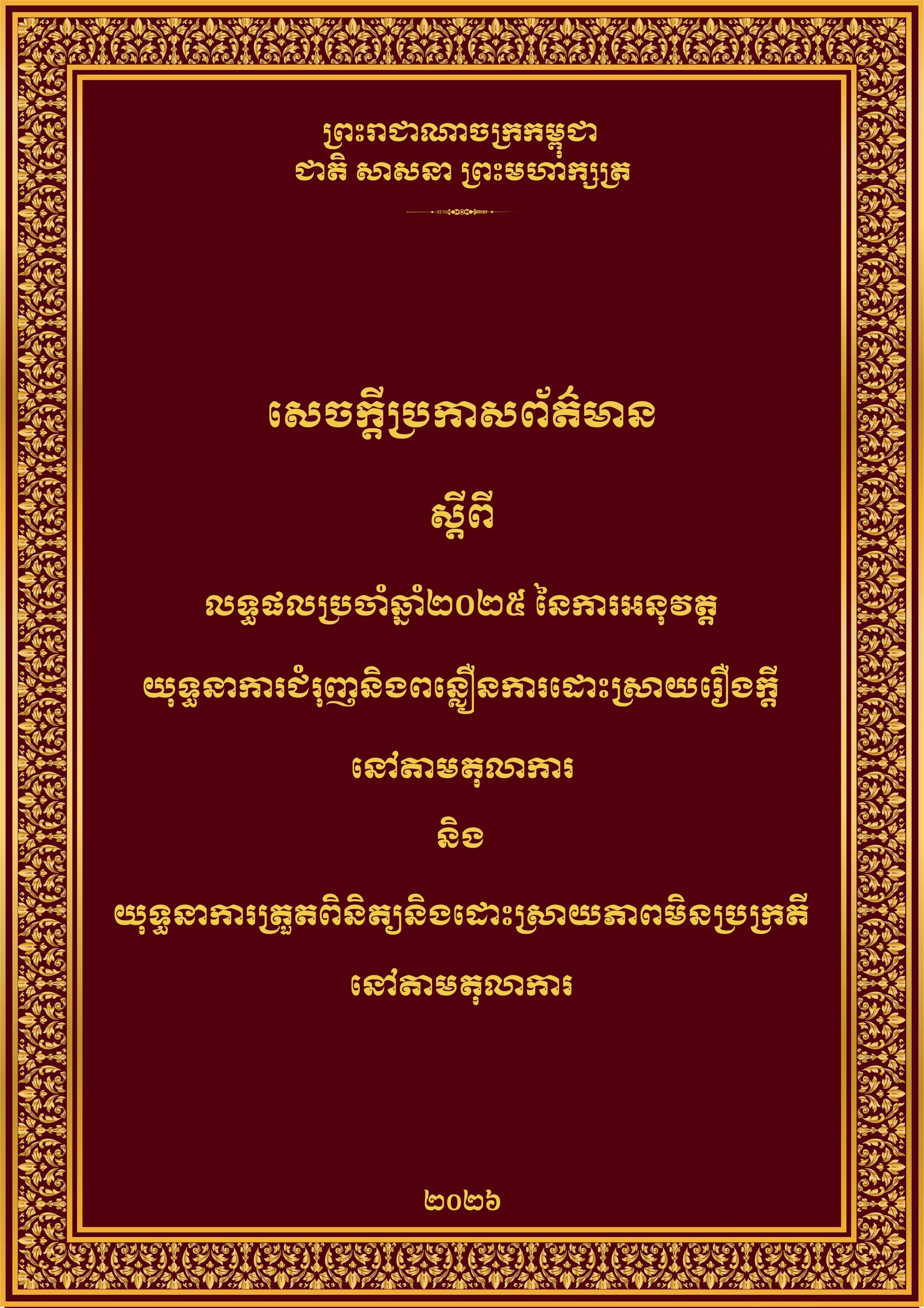 ក្នុងឆ្នាំ២០២៥ តុលាការគ្រប់ជាន់ថ្នាក់បានចាត់ការសំណុំរឿងព្រហ្មទណ្ឌ និងរដ្ឋប្បវេណីជាង ១៧ម៉ឺន ស្មើនឹង ៨០,៣០% នៃសំណុំរឿងសរុបទូទាំងប្រទេសជាង ២១ម៉ឺន