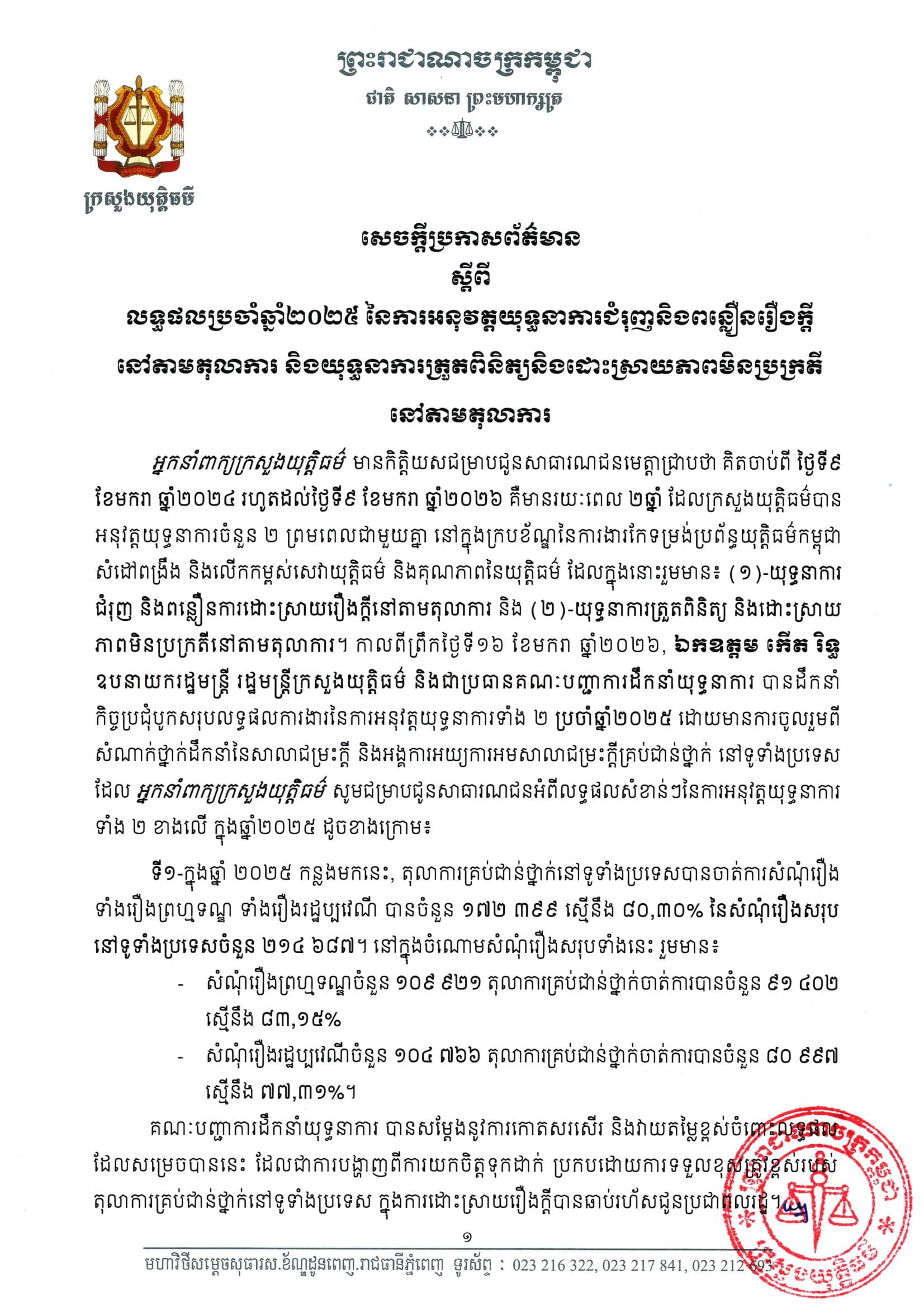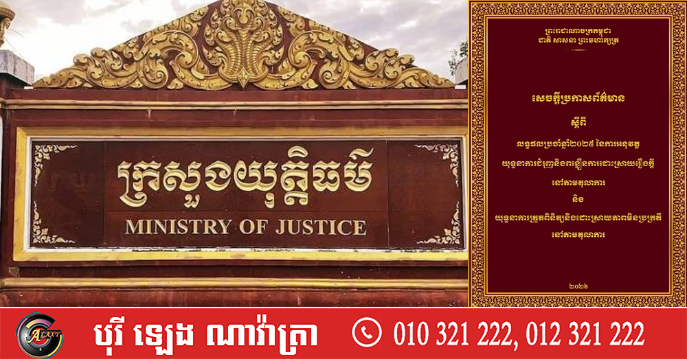 (ភ្នំពេញ)៖ អ្នកនាំពាក្យក្រសួងយុត្តិធម៌ តាមរយៈសេចក្តីប្រកាសព័ត៌មាន បានបង្ហាញអំពីលទ្ធផលសំខាន់ៗនៃការអនុវត្តយុទ្ធនាការជំរុញ និងពន្លឿនរឿងក្តី នៅតាមតុលាការ និងយុទ្ធនាការត្រួតពិនិត្យ និងដោះស្រាយភាពមិនប្រក្រតីនៅតាមតុលាការ នៅក្នុងឆ្នាំ២០២៥។