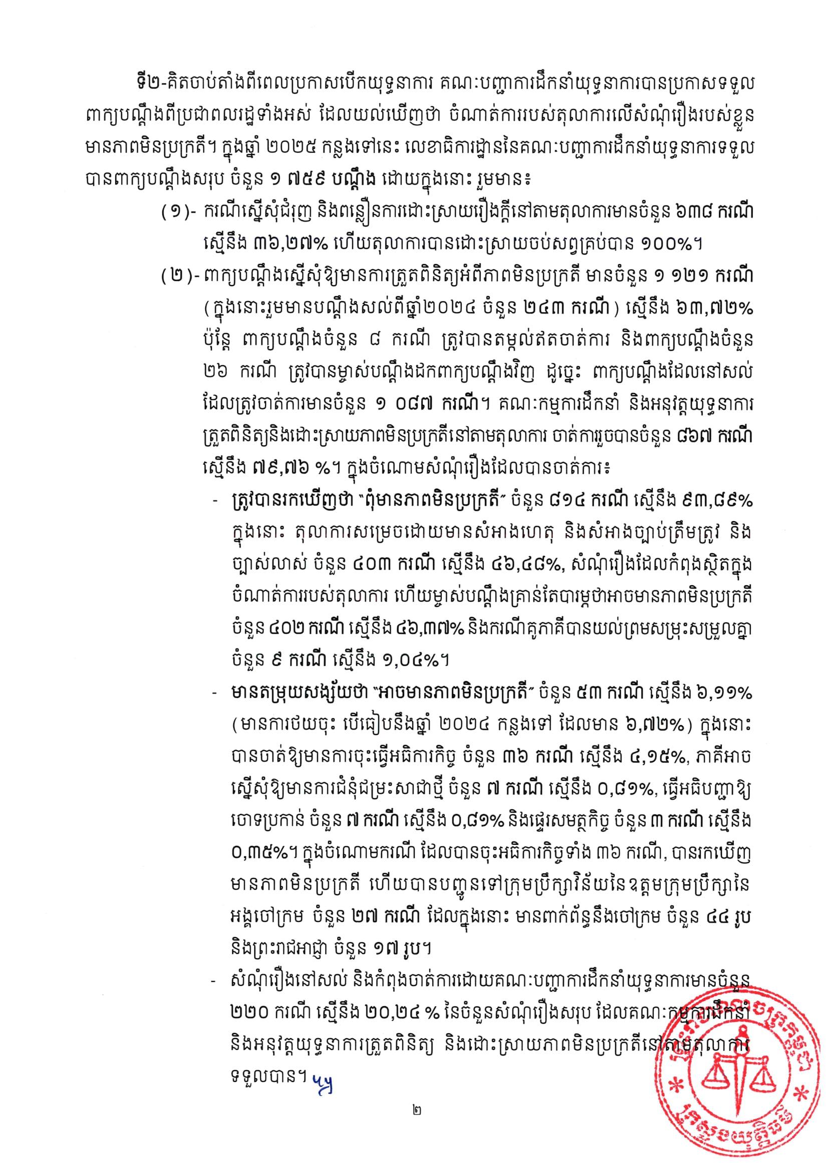 ២)- ពាក្យបណ្តឹងស្នើសុំឱ្យមានការត្រួតពិនិត្យអំពីភាពមិនប្រក្រតី មានចំនួន ១ ១២១ករណី (ក្នុងនោះរួមមានបណ្ដឹងសល់ពីឆ្នាំ២០២៤ ចំនួន ២៤៣ ករណី) ស្មើនឹង ៦៣,៧២% ប៉ុន្តែ ពាក្យបណ្តឹងចំនួន ៨ករណី ត្រូវបានតម្កល់ឥតចាត់ការ និងពាក្យបណ្តឹងចំនួន ២៦ករណី ត្រូវបានម្ចាស់បណ្ដឹងដកពាក្យបណ្តឹងវិញ ដូច្នេះ ពាក្យបណ្ដឹងដែលនៅសល់ ដែលត្រូវចាត់ការមានចំនួន ១ ០៨៧ករណី។ គណៈកម្មការដឹកនាំ និងអនុវត្តយុទ្ធនាការត្រួតពិនិត្យនិងដោះស្រាយភាពមិនប្រក្រតីនៅតាមតុលាការ ចាត់ការរួចបានចំនួន ៨៦៧ ករណី ស្មើនឹង ៧៩,៧៦%។ ក្នុងចំណោមសំណុំរឿងដែលបានចាត់ការ៖