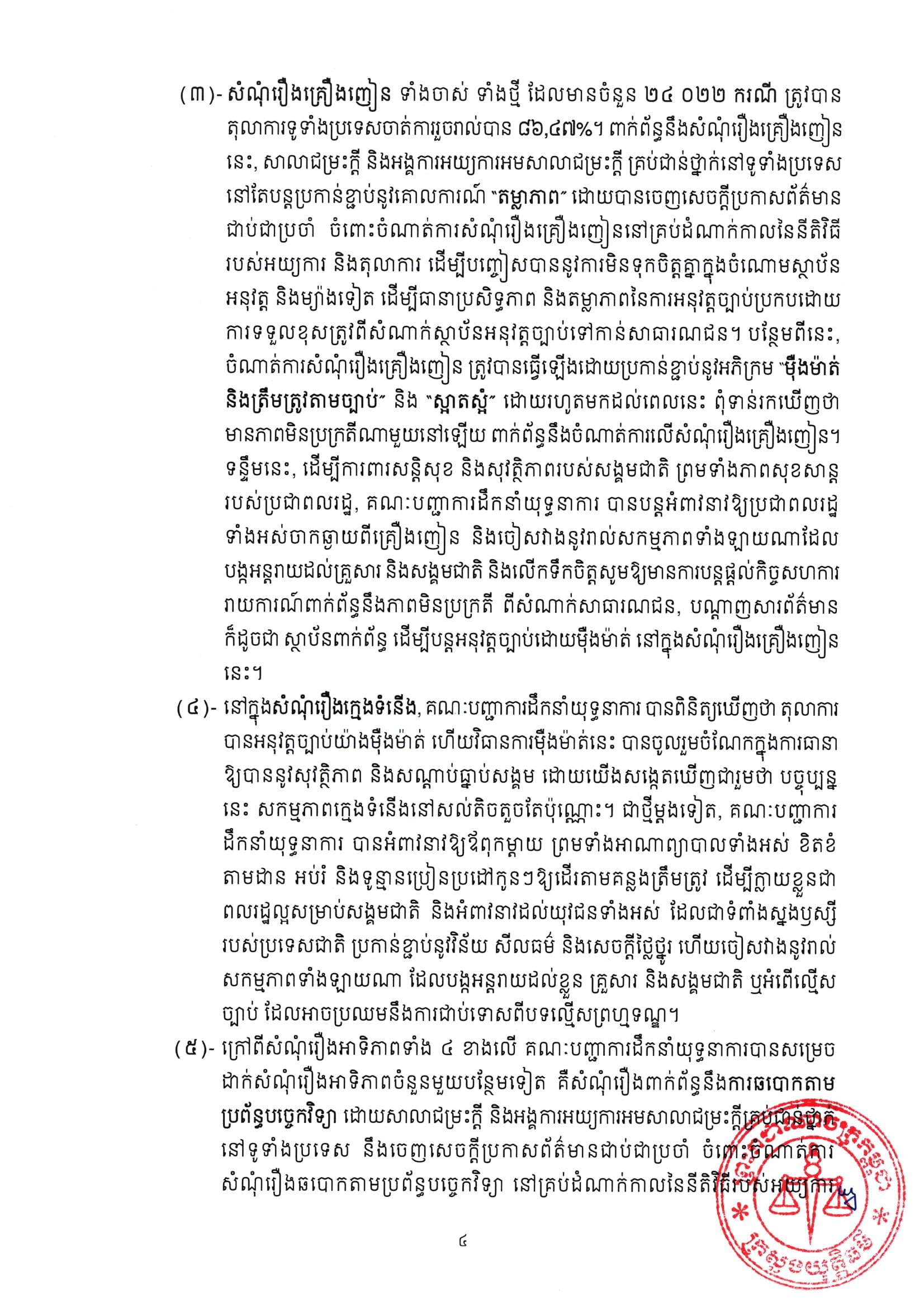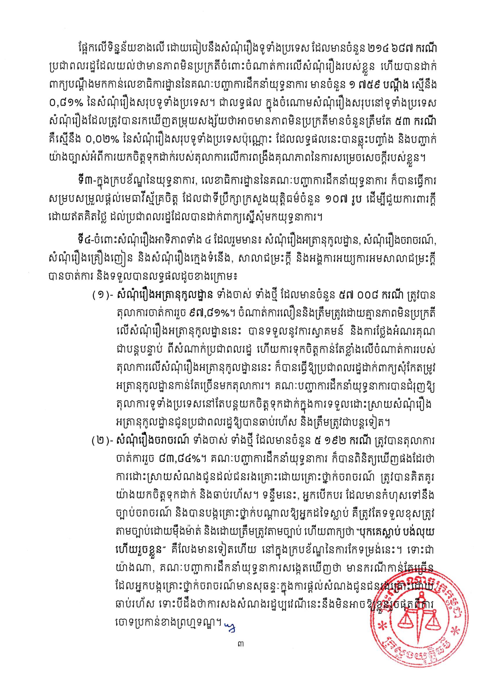 ផ្អែកលើទិន្នន័យខាងលើ ដោយធៀបនឹងសំណុំរឿងទូទាំងប្រទេស ដែលមានចំនួន ២១៤ ៦៨៧ករណី ប្រជាពលរដ្ឋដែលយល់ថាមានភាពមិនប្រក្រតីចំពោះចំណាត់ការលើសំណុំរឿងរបស់ខ្លួន ហើយបានដាក់ពាក្យបណ្ដឹងមកកាន់លេខាធិការដ្ឋាននៃគណៈបញ្ជាការដឹកនាំយុទ្ធនាការ មានចំនួន ១ ៧៥៩ បណ្តឹង ស្មើនឹង ០,៨១% នៃសំណុំរឿងសរុបទូទាំងប្រទេស។ ជាលទ្ធផល ក្នុងចំណោមសំណុំរឿងសរុបនៅទូទាំងប្រទេស សំណុំរឿងដែលត្រូវបានរកឃើញតម្រុយសង្ស័យថាអាចមានភាពមិនប្រក្រតីមានចំនួនត្រឹមតែ ៥៣ករណី គឺស្មើនឹង ០,០២% នៃសំណុំរឿងសរុបទូទាំងប្រទេសប៉ុណ្ណោះ ដែលលទ្ធផលនេះបានឆ្លុះបញ្ចាំង និងបញ្ជាក់ យ៉ាងច្បាស់អំពីការយកចិត្តទុកដាក់របស់តុលាការលើការពង្រឹងគុណភាពនៃការសម្រេចសេចក្តីរបស់ខ្លួន៕