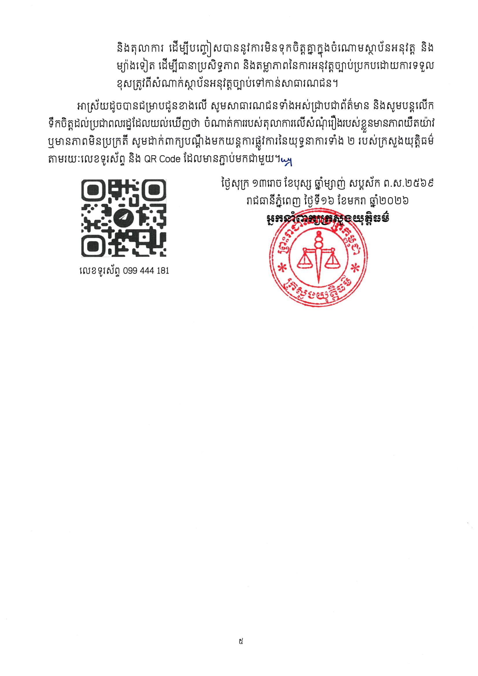 ទី២៖ គិតចាប់តាំងពីពេលប្រកាសបើកយុទ្ធនាការ គណៈបញ្ជាការដឹកនាំយុទ្ធនាការបានប្រកាសទទួលពាក្យបណ្ដឹងពីប្រជាពលរដ្ឋទាំងអស់ ដែលយល់ឃើញថា ចំណាត់ការរបស់តុលាការលើសំណុំរឿងរបស់ខ្លួន មានភាពមិនប្រក្រតី។ ក្នុងឆ្នាំ២០២៥ កន្លងទៅនេះ លេខាធិការដ្ឋាននៃគណៈបញ្ជាការដឹកនាំយុទ្ធនាការទទួល បានពាក្យបណ្តឹង ចំនួន ១ ៧៥៩បណ្ដឹង ដោយក្នុងនោះរួមមាន៖