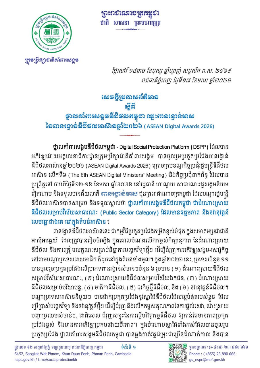 (ភ្នំពេញ)៖ ថ្នាលគាំពារសង្គមឌីជីថលកម្ពុជា - Digital Social Protection Platform (DSPP) ដែលបានអភិវឌ្ឍដោយអគ្គលេខាធិការដ្ឋានក្រុមប្រឹក្សាជាតិគាំពារសង្គម បានចូលរួមប្រកួតប្រជែងពានរង្វាន់ឌីជីថលអាស៊ាន ឆ្នាំ២០២៦ (ASEAN Digital Awards 2026) ក្រោមក្របខណ្ឌកិច្ចប្រជុំរដ្ឋមន្ត្រីឌីជីថលអាស៊ាន លើកទី៦ (The 6th ASEAN Digital Ministers’ Meeting) និងកិច្ចប្រជុំពាក់ព័ន្ធ ដែលបានប្រព្រឹត្តទៅចាប់ពីថ្ងៃទី១២-១៦ ខែមករា ឆ្នាំ២០២៦ នៅរដ្ឋធានី ហាណូយ សាធារណៈរដ្ឋសង្គមនិយមវៀតណាម និងទទួលបានជ័យលាភីពានរង្វាន់មាស ជូនព្រះរាជាណាចក្រកម្ពុជា ដែលបណ្តារដ្ឋមន្រ្តីឌីជីថលអាស៊ានបានសម្រេច និងទទួលស្គាល់ថា ថ្នាលគាំពារសង្គមឌីជីថលកម្ពុជា ជាដំណោះស្រាយឌីជីថលសម្រាប់វិស័យសាធារណៈ (Public Sector Category) ដែលមានឧត្តមភាព និងនវានុវត្តន៍លេចធ្លោជាងគេ នៅក្នុងតំបន់អាស៊ាន។