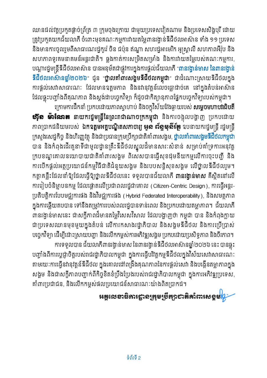 ការទទួលបាន ជ័យលាភីពានរង្វាន់មាស នៃពានរង្វាន់ឌីជីថលអាស៊ានឆ្នាំ២០២៦ នេះ បានឆ្លុះបញ្ចាំងពីការប្តេជ្ញាចិត្តរបស់រាជរដ្ឋាភិបាលកម្ពុជា ក្នុងការធ្វើបរិវត្តកម្មឌីជីថលក្នុងវិស័យសេវាសាធារណៈតាមរយៈការធ្វើនវានុវត្តន៍ឌីជីថល ក្នុងគោលដៅពង្រឹងគុណភាពនៃការផ្តល់សេវា និងបង្កើនតម្លាភាពក្នុងសង្គម និងជាសក្ខីភាពបញ្ជាក់ពីកិច្ចខិតខំប្រឹងប្រែងរបស់រាជរដ្ឋាភិបាលកម្ពុជា ក្នុងការអភិវឌ្ឍប្រទេស, គាំពារប្រជាជន, និងលើកកម្ពស់ផលប្រយោជន៍សាធារណៈយ៉ាងពិតប្រាកដ៕
