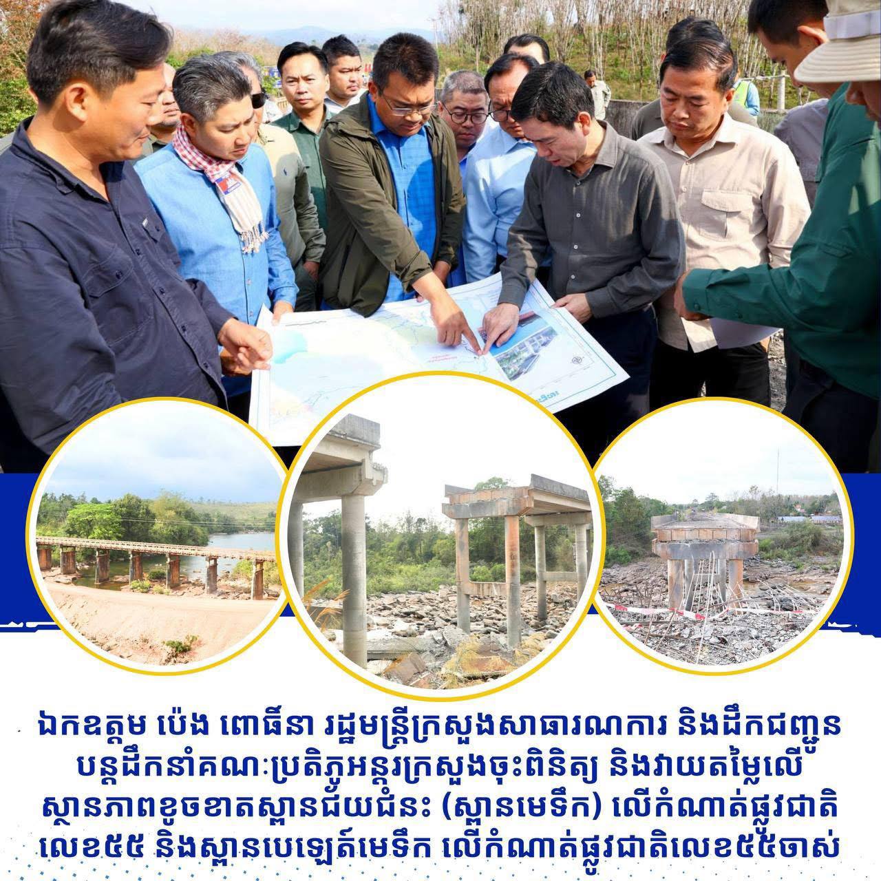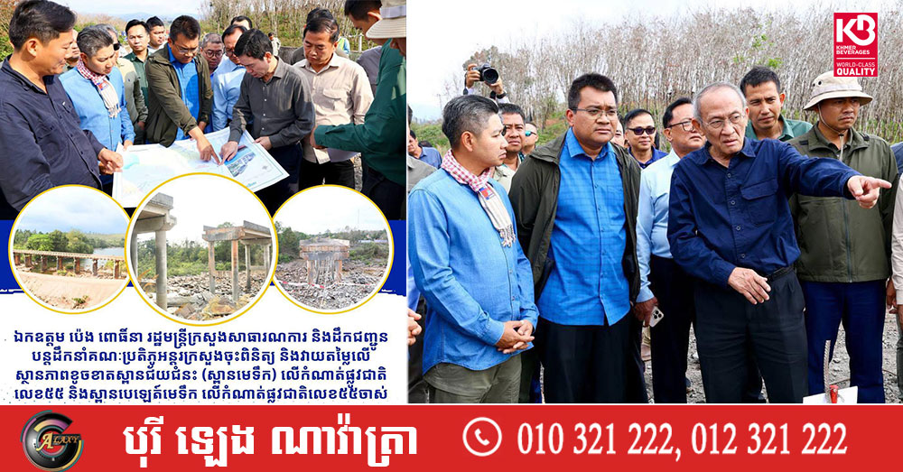 រដ្ឋមន្ត្រី ប៉េង ពោធិ៍នា បន្តចុះពិនិត្យ និងវាយតម្លៃលើស្ថានភាពខូចខាតស្ពានជ័យជំនះ (ស្ពានមេទឹក) លើកំណាត់ផ្លូវជាតិលេខ៥៥ និងស្ពានបេឡេត៍មេទឹក លើកំណាត់ផ្លូវជាតិលេខ៥៥ចាស់