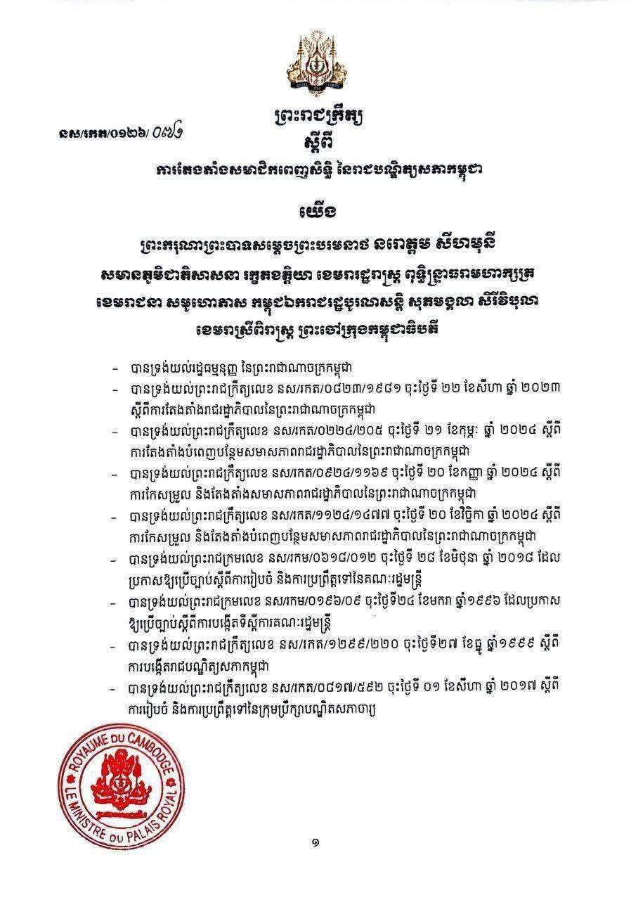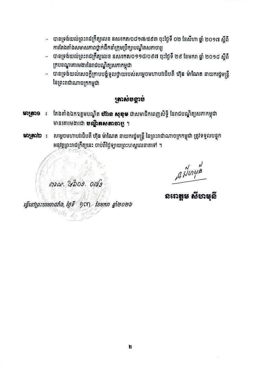 (ភ្នំពេញ)៖ ព្រះករុណា ព្រះបាទសម្ដេចព្រះ បរមនាថ នរោត្តម សីហមុនី ព្រះមហាក្សត្រនៃព្រះរាជាណាចក្រកម្ពុជា បានចេញព្រះរាជក្រឹត្យតែងតាំងបណ្ឌិត ហ៊ាន សុខុម ជាសមាជិកពេញសិទ្ធិ នៃរាជបណ្ឌិត្យសភាកម្ពុជា មានគោរមងារជា បណ្ឌិតសភាចារ្យ៕