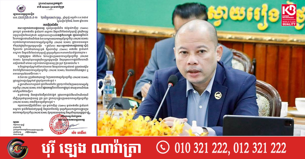 (ស្វាយរៀង)៖ គណៈបញ្ជាការឯកភាពរដ្ឋបាលខេត្ត ស្វាយរៀងនៅថ្ងៃទី១៨ ខែមករា ឆ្នាំ២០២៦ បានជូនដំណឹង ដល់ម្ចាស់កាស៊ីណូ (Casino) ស្របច្បាប់ ម្ចាស់អាផាតមិន ផ្ទះសំណាក់ សណ្ឋាគារ និងម្ចាស់ទីតាំងរស់នៅប្រមូលផ្តុំ ក្នុងភូមិសាស្ត្រ ខេត្តស្វាយរៀងទាំងអស់ជ្រាបថា អនុវត្តតាមបទបញ្ជារបស់រាជរដ្ឋាភិបាលកម្ពុជា រដ្ឋបាលខេត្តនឹងចាត់ វិធានការបង្រ្កាបដោយមិនលើកលែង ចំពោះសកម្មភាពឆបោកតាមប្រព័ន្ធបច្ចេកវិទ្យា (ONLINE SCAMS) រហូតដល់សកម្មភាពភាពឆបោកតាមប្រព័ន្ធបច្ចេកវិទ្យា (ONLINE SCAMS) ត្រូវបានបោសសម្អាត ទាំងស្រុងក្នុងភូមិសាស្ត្រខេត្តស្វាយរៀង។