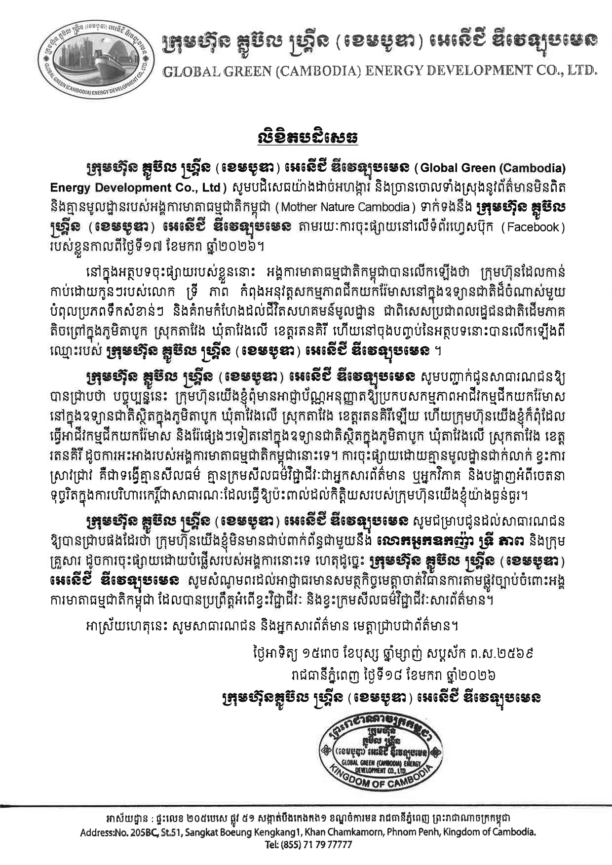 ដើម្បីរក្សាកិត្តិយស និងភាពស្អាតស្អំរបស់ខ្លួន ក្រុមហ៊ុន គ្លូប៊ល ហ្គ្រីន បានសំណូមពរដល់អាជ្ញាធរមានសមត្ថកិច្ចមេត្តាចាត់វិធានការតាមផ្លូវច្បាប់ចំពោះការផ្សាយខុសពីការពិតលើទំព័រហ្វេសប៊ុក «Mother Nature Cambodia»៕