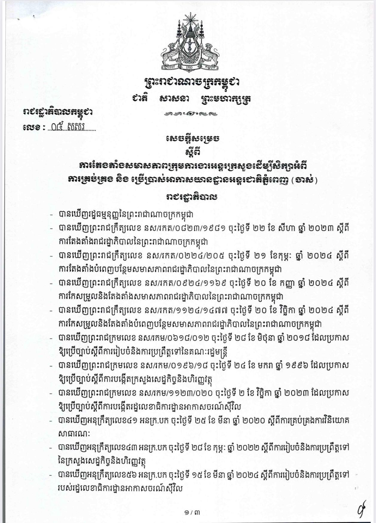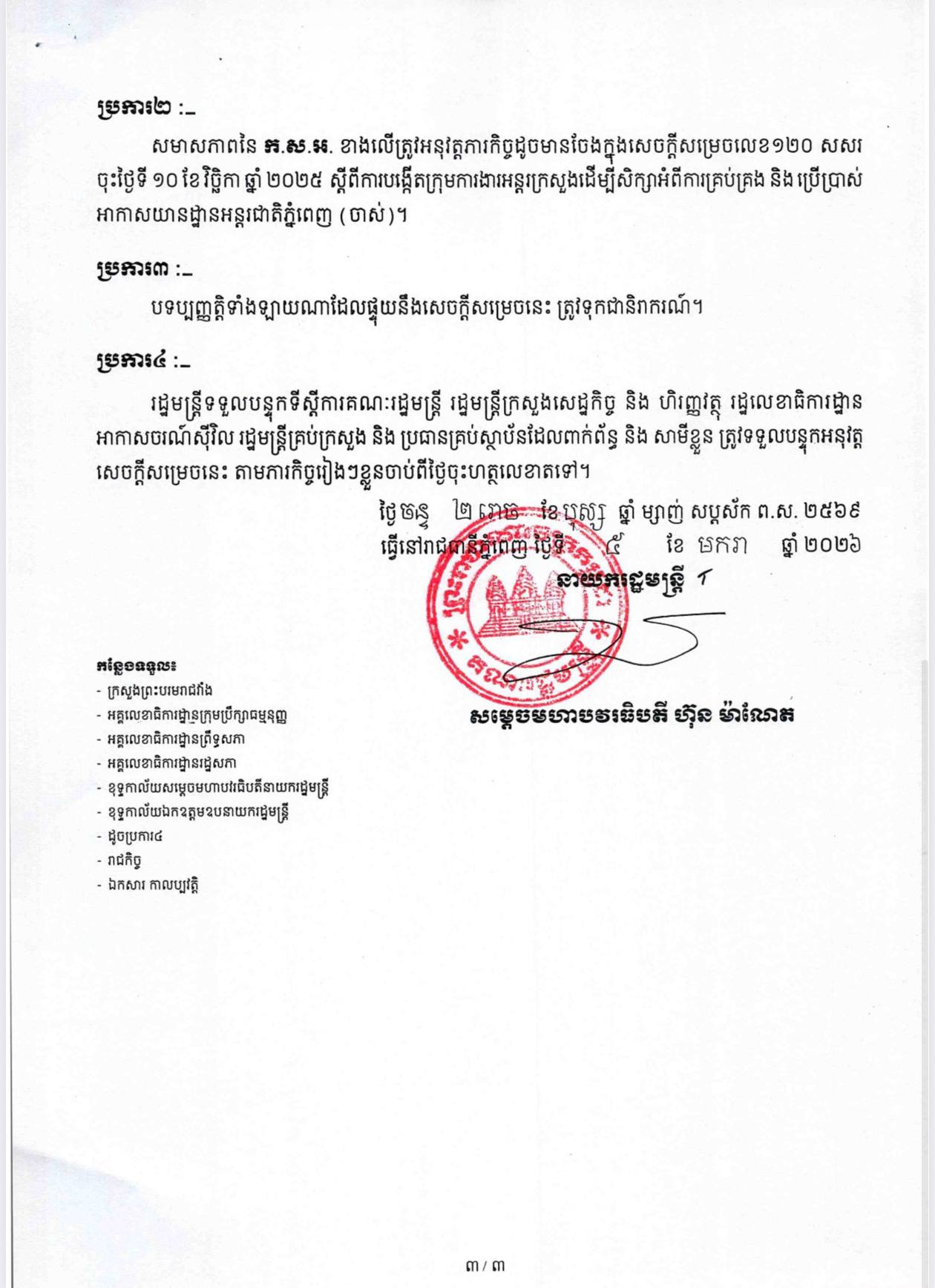 សម្តេចបវរធិបតី ហ៊ុន ម៉ាណែត ចេញសេចក្តីសម្រេចស្តីពីការតែងតាំងសមាសភាពក្រុមការងារអន្តរក្រសួង ដើម្បីសិក្សាអំពីការគ្រប់គ្រង និងប្រើប្រាស់អាកាសយានដ្ឋានអន្តរជាតិភ្នំពេញ (ចាស់) (Video inside)