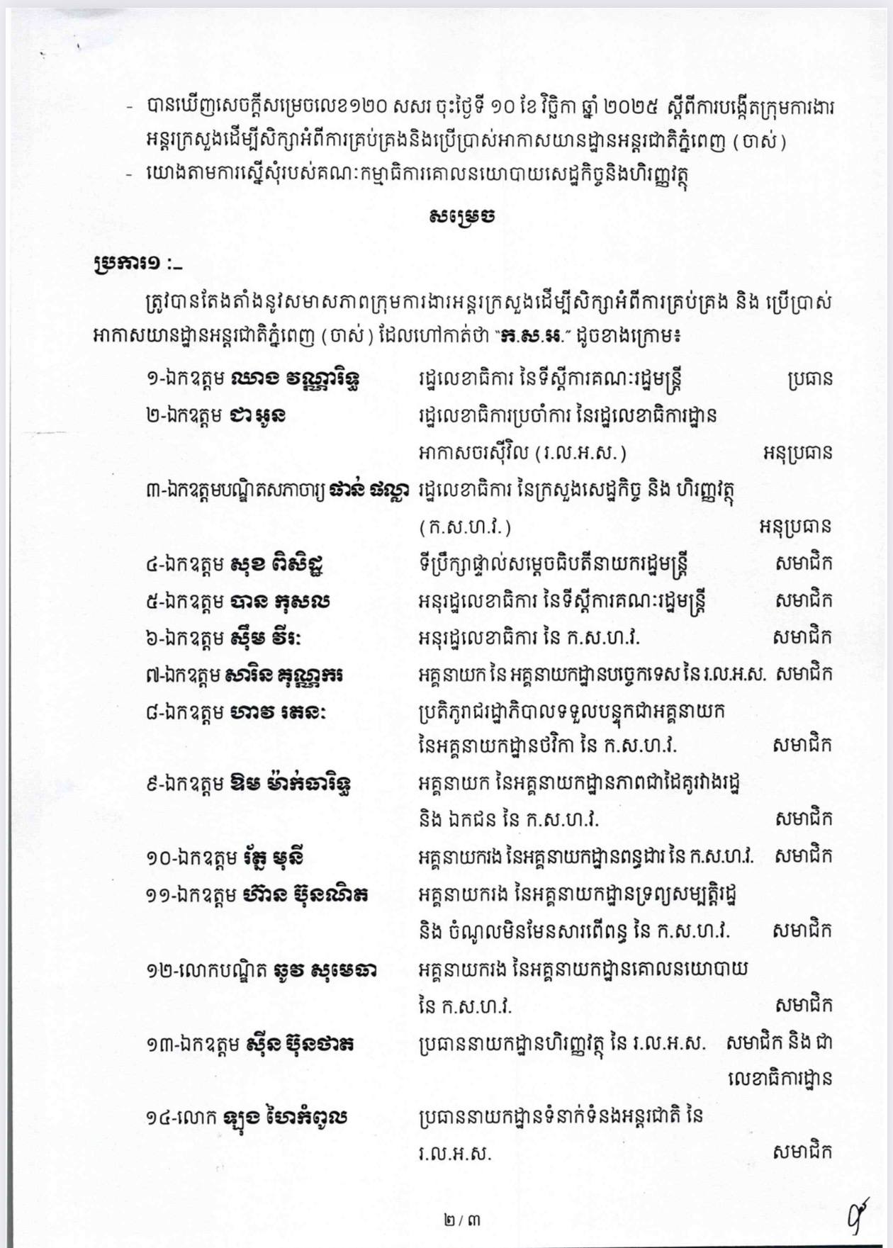 តាមសេចក្តីសម្រេចរបស់សម្តេចបវរធិបតី ហ៊ុន ម៉ាណែត បានបញ្ជាក់ថា ត្រូវបានតែងតាំងនូវសមាសភាពក្រុមការងារអន្តរក្រសួងដើម្បីសិក្សាអំពីការគ្រប់គ្រង និងប្រើប្រាស់ អាកាសយានដ្ឋានអន្តរជាតិភ្នំពេញ (ចាស់) ដែលហៅកាត់ថា “ក.ស.អ.” ដែលមានលោក ឈាង វណ្ណារិទ្ធ រដ្ឋលេខាធិការ នៃទីស្តីការគណៈរដ្ឋមន្ត្រី ជាប្រធាន អមដោយអនុប្រធាន និងសមាជិកជាច្រើនរូបទៀត៕