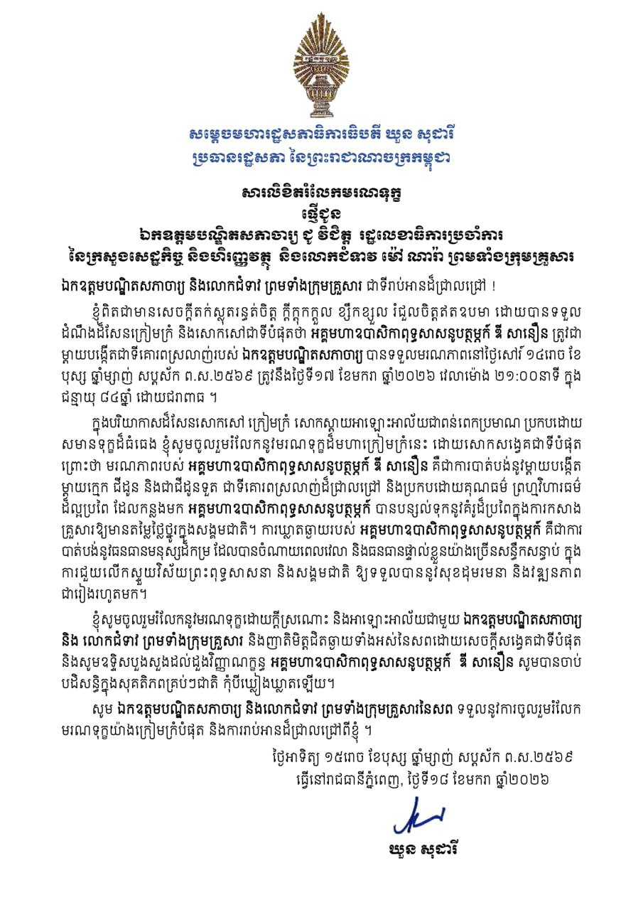 សម្តេចរដ្ឋសភាធិការធិបតី ឃួន សុដារី ផ្ញើសាររំលែកទុក្ខជូនបណ្ឌិតសភាចារ្យ ជូ វិជិត្ត ចំពោះដំណឹងមរណភាពអគ្គមហាឧបាសិកាពុទ្ធសាសនូបត្ថម្ភក៏ ឌី សានឿន ដែលត្រូវជាម្តាយបង្កើត