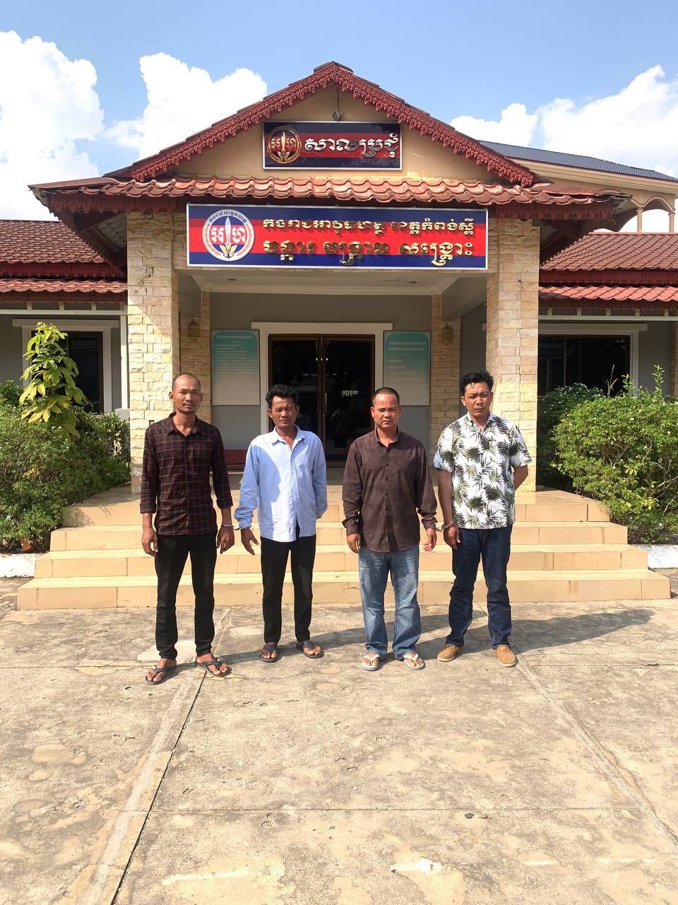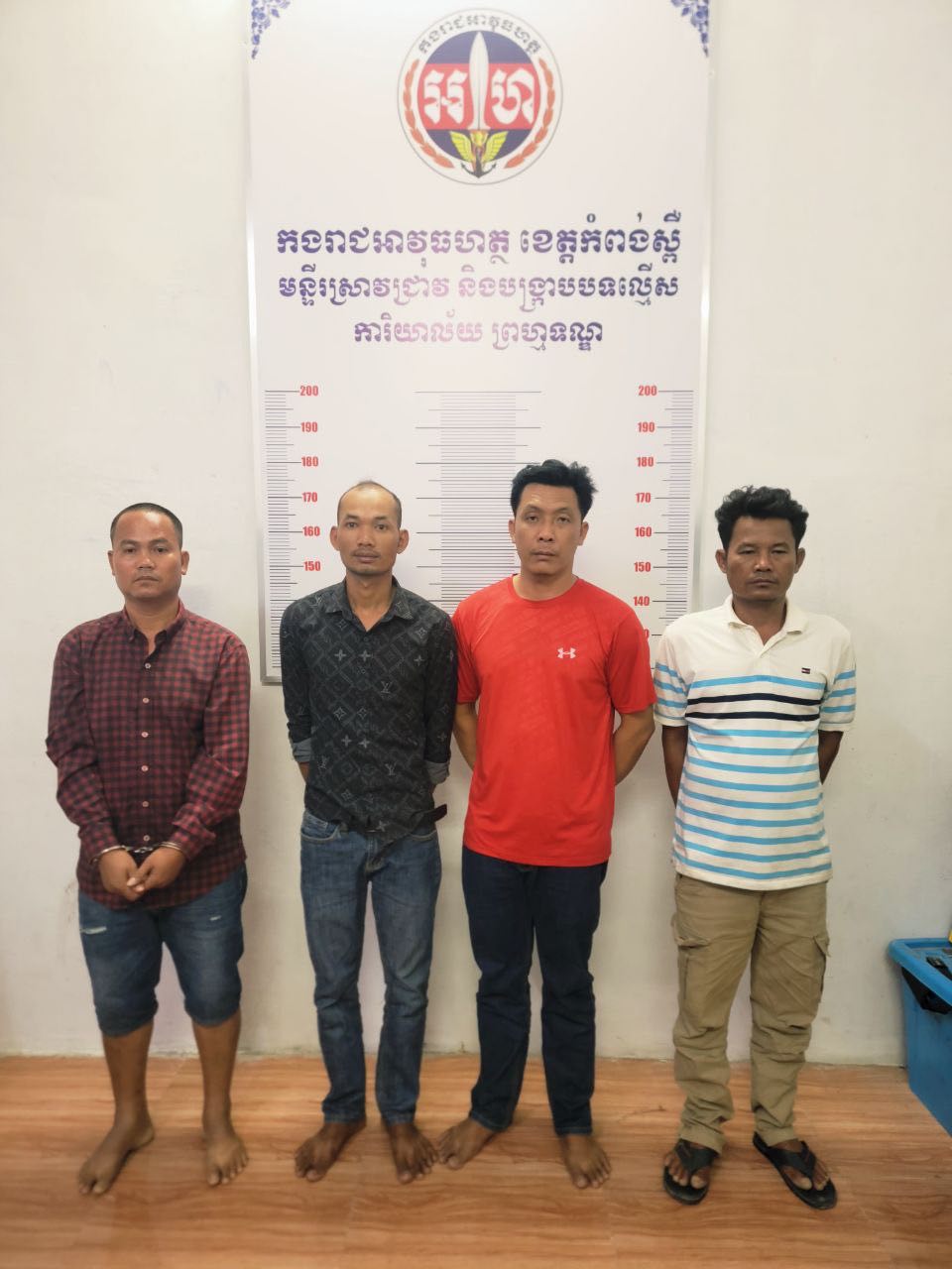 ជនសង្ស័យទី១៖ ឈ្មោះ ម៉ែន ថា ភេទប្រុស អាយុ ៣៦ឆ្នាំ មុខរបរកម្មកររោងចក្រ, ទី២៖ ឈ្មោះ ខេន ណារ៉ុម ភេទប្រុស អាយុ៤៥ឆ្នាំ មុខរបរកម្មកររោងចក្រ, ទី៣៖ ឈ្មោះ មៀច សំអុល ភេទប្រុស អាយុ៤៤ឆ្នាំ មុខរបរកម្មកររោងចក្រ និនិងជាសង្ស័យទី៤៖ ឈ្មោះ សាយ ពិសិទ្ធ ភេទប្រុស អាយុ៣៦ឆ្នាំ មុខរបរកម្មកររោងចក្រ ដោយជនសង្ស័យទាំង០៤នាក់នេះ មានទីលំនៅបច្ចុប្បន្ន ភូមិប្រវឹងពង ឃុំទឹកល្អក់ ស្រុកគងពិសី ខេត្តកំពង់ស្ពឺ។ ចាប់យកវត្ថុតាងបានរួមមានទូរស័ព្ទដៃចំនួន០៤គ្រឿង។