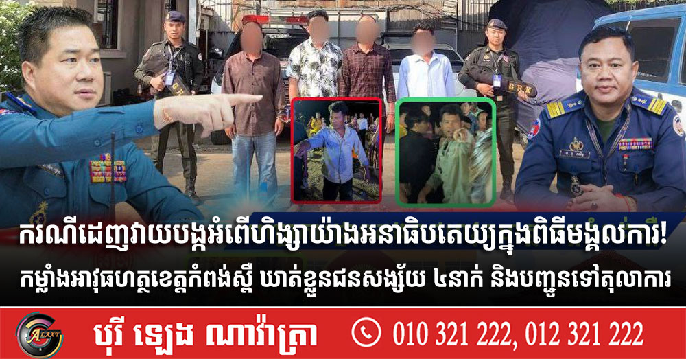 ករណីដេញវាយបង្កអំពើហិង្សាយ៉ាងអនាធិបតេយ្យក្នុងពិធីមង្គលការ! កម្លាំងអាវុធហត្ថខេត្តកំពង់ស្ពឺ ឃាត់ខ្លួនជនសង្ស័យ ៤នាក់ និងបញ្ជូនទៅតុលាការ