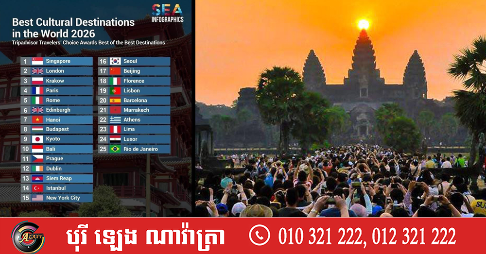(ភ្នំពេញ)៖ ទីក្រុងសៀមរាប ដែនដីដ៏ផូរផង់របស់កម្ពុជា បានជាប់ជាទីក្រុង១ ក្នុងចំណោមទីក្រុងទេសចរណ៍វប្បធម៌ល្អបំផុត នៅលើពិភពលោក ឆ្នាំ២០២៦ ទាំង២៥ ក្នុងពានរង្វាន់ជម្រើសអ្នកធ្វើដំណើរ របស់គេហទំព័រTripadvisor ។