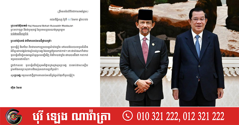 (ភ្នំពេញ)៖ សម្តេចតេជោ ហ៊ុន សែន ប្រធានព្រឹទ្ធសភាកម្ពុជា នៅថ្ងៃទី១៩ ខែមករា ឆ្នាំ២០២៦នេះ បានផ្ញើសារលិខិតថ្វាយ ព្រះចៅស៊ុលតង់ ព្រះមហាក្សត្រ និងជាប្រមុខរដ្ឋ នៃប្រទេសព្រុយណេ ដើម្បីបួងសួងសូមព្រះអង្គ បានឆាប់ជាសះស្បើយ ព្រមទាំងមានព្រះសុខភាពនិងសុខុមាលភាពល្អបរិបូរណ៍។