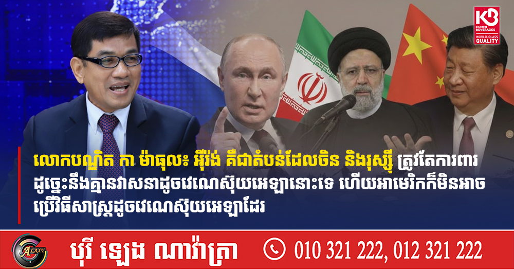 (ភ្នំពេញ)៖ លោកបណ្ឌិត កា ម៉ាធុល បានលើកឡើងថា អ៉ីរ៉ង់ គឺជាតំបន់ដែលចិន និងរុស្ស៉ី ត្រូវតែការពារ ដូច្នេះនឹងគ្មានវាសនាដូចវេណេស៊ុយអេឡានោះទេ ហើយអាមេរិកក៏មិនអាចប្រើវិធីសាស្រ្តដូចវេណេស៊ុយអេឡាដែរ។ លោកលើកឡើងបែបនេះ នៅក្នុងកិច្ចពិភាក្សា Fresh Talk នាចុងសប្តាហ៍កន្លងទៅនេះ។